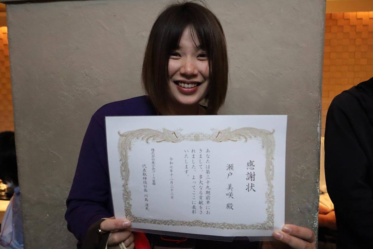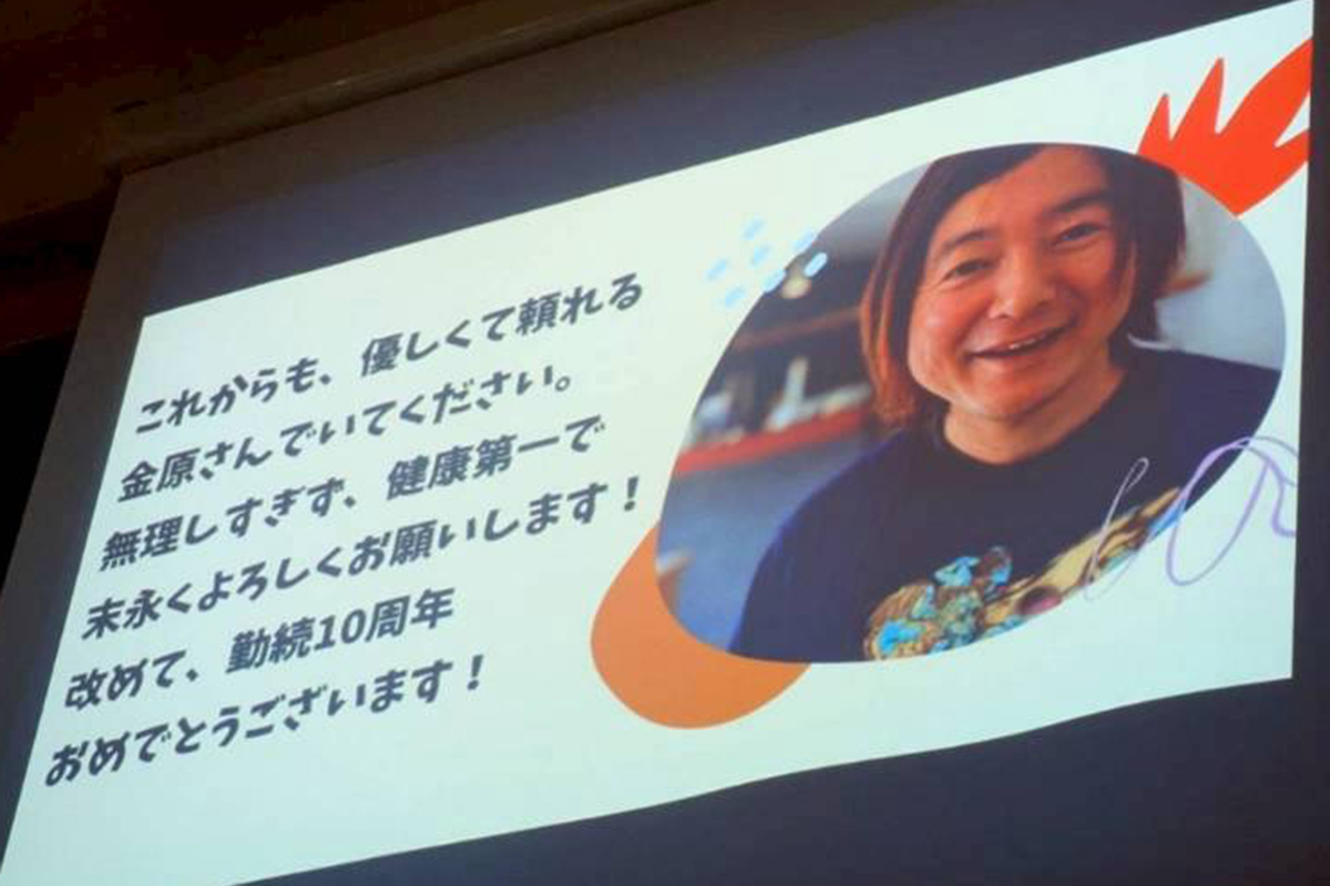 MVPの勝原さん・瀬戸さんもおめでとう。今年も見事な活躍だったね。そして、金原の10年勤続も本当におめでとう。紆余曲折はあったけれど、会社のためにいつも尽力してくれて感謝しているよ。ミスター大器晩成、これからもよろしくね。