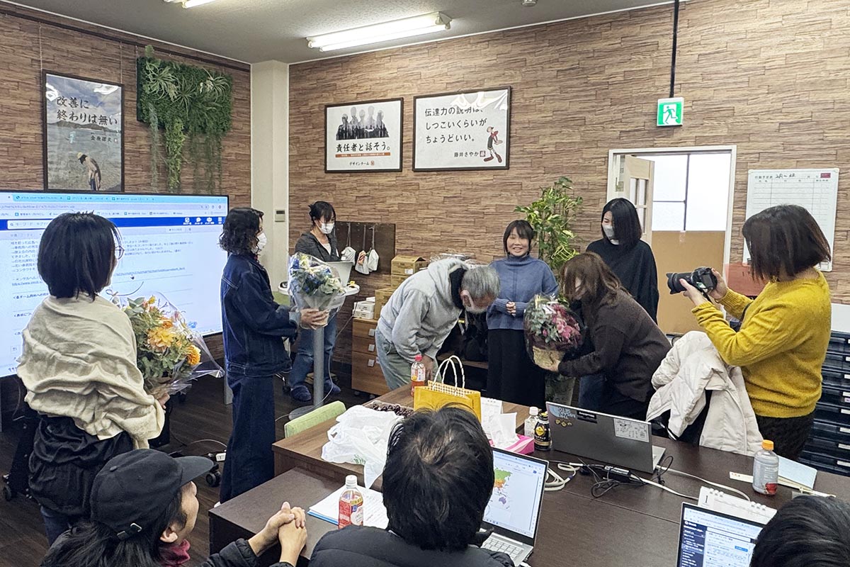 会議の合間にお祝いです。みずがめ座5名にサプライズケーキプレゼント。ケーキは似顔絵入り(AI作)。5名とも微妙に似ていないのが面白いところ。藤井さんナイスアイデアだね。あとは入社1年が経過した3名にも改めてお花をプレゼント。わずか1年間でこんなにも成長してくれて本当に嬉しい限り。ますますの活躍を期待してるよ!