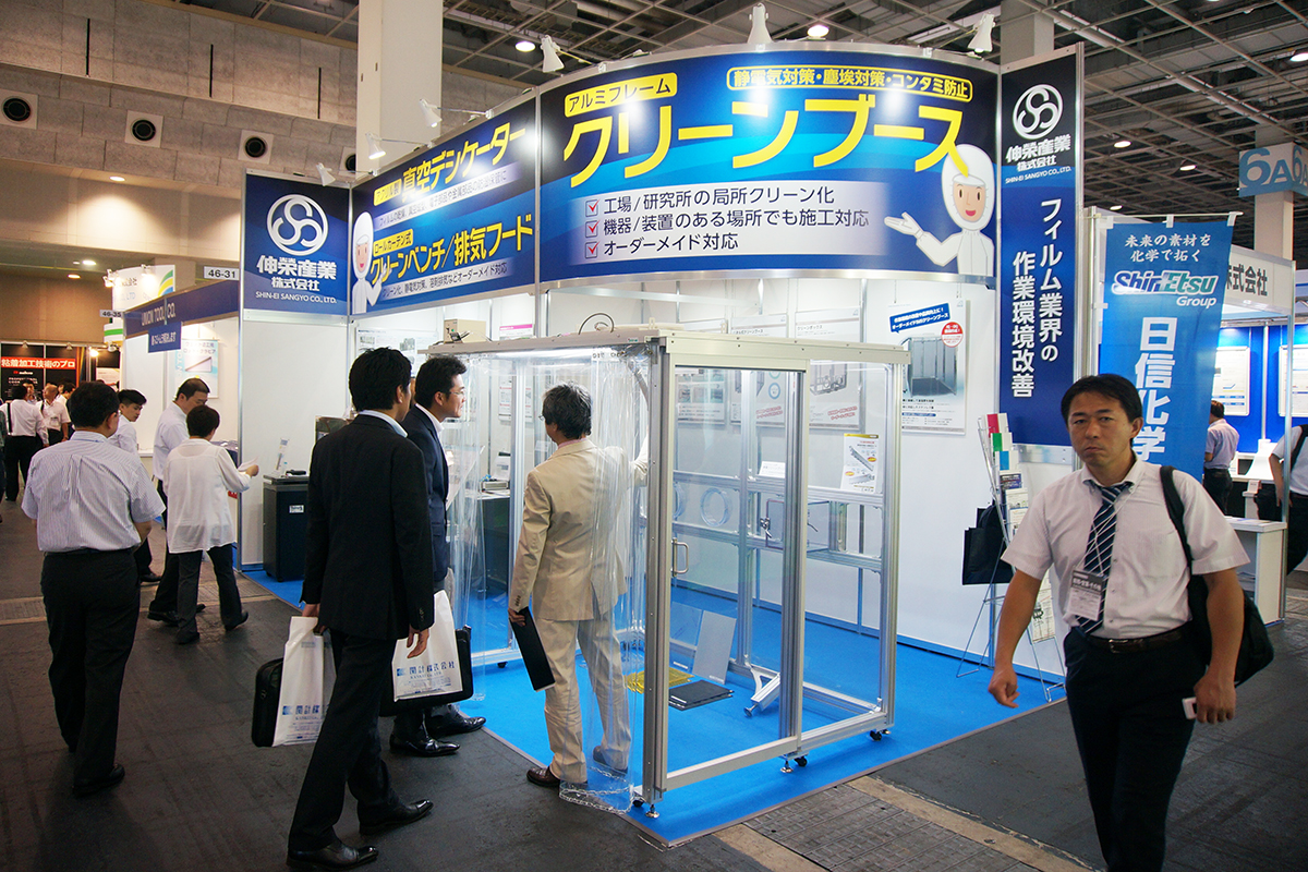 装置を来場者の目に留めさせるために、ブース前方角に配置しています。その上を取り囲むように、上部看板と縦型看板を設置し、装置のメリット・他の製品・機能を訴求しています。