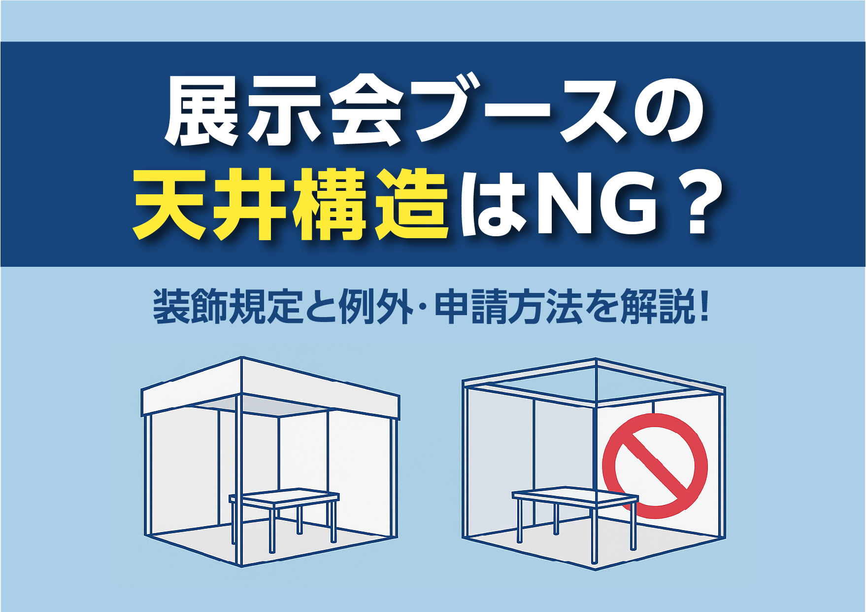お客様から「ブースに天井を付けたい」というご相談をいただくことがありますが、展示会において天井構造を伴う装飾は、原則NGとされているケースが多く、注意が必要なポイントのひとつです。