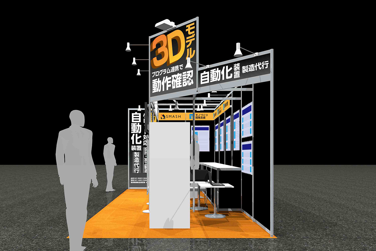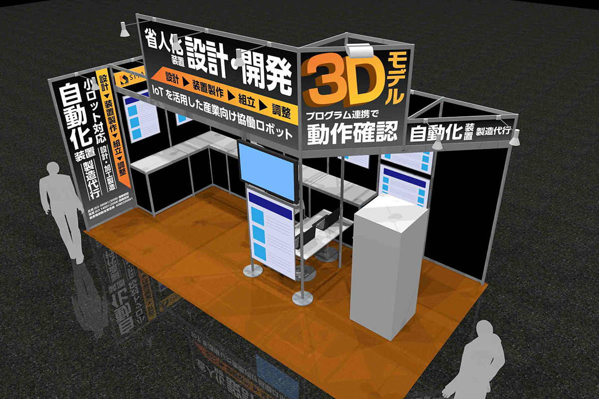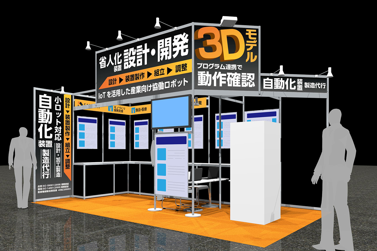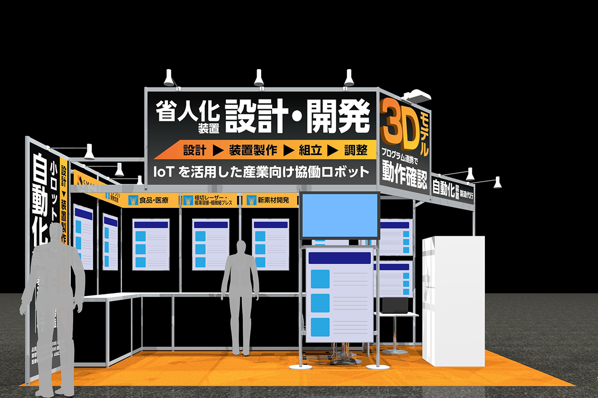 出展製品としてやや大型のロボット装置があり、これは最も重要な展示物となりますのでブース内で最も目立つブース角の位置に配置しました。