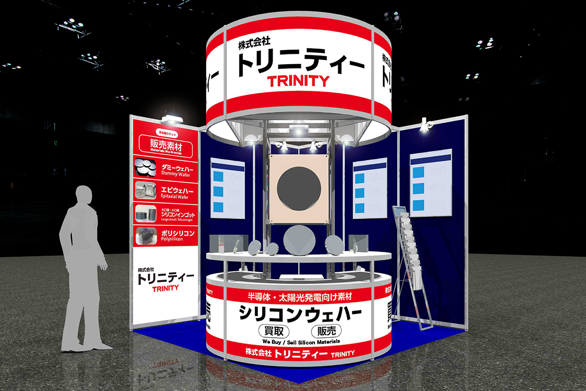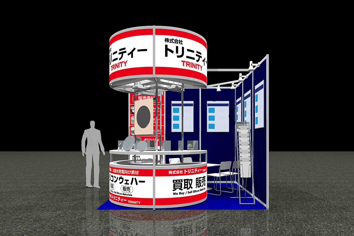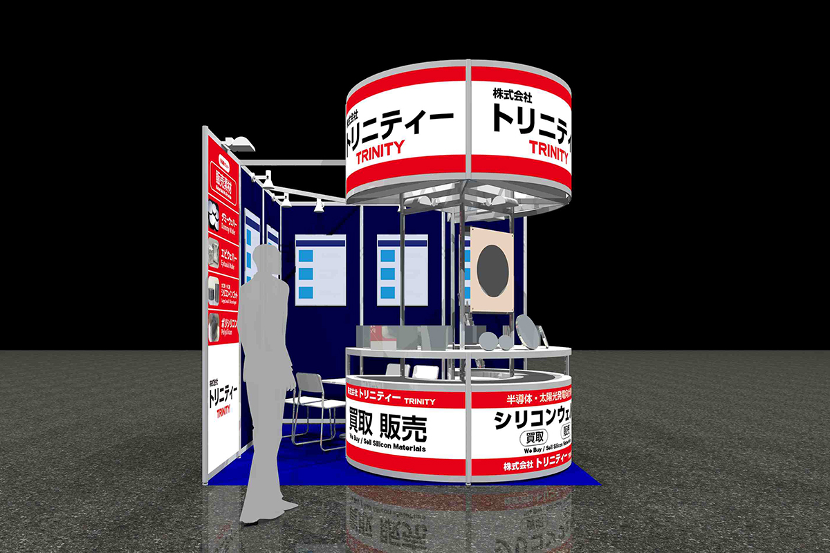 看板の向きはブース後方からきた来場者様にもシリコン材料の「買取販売」をしていることを理解してもらうために見やすく配置しました。