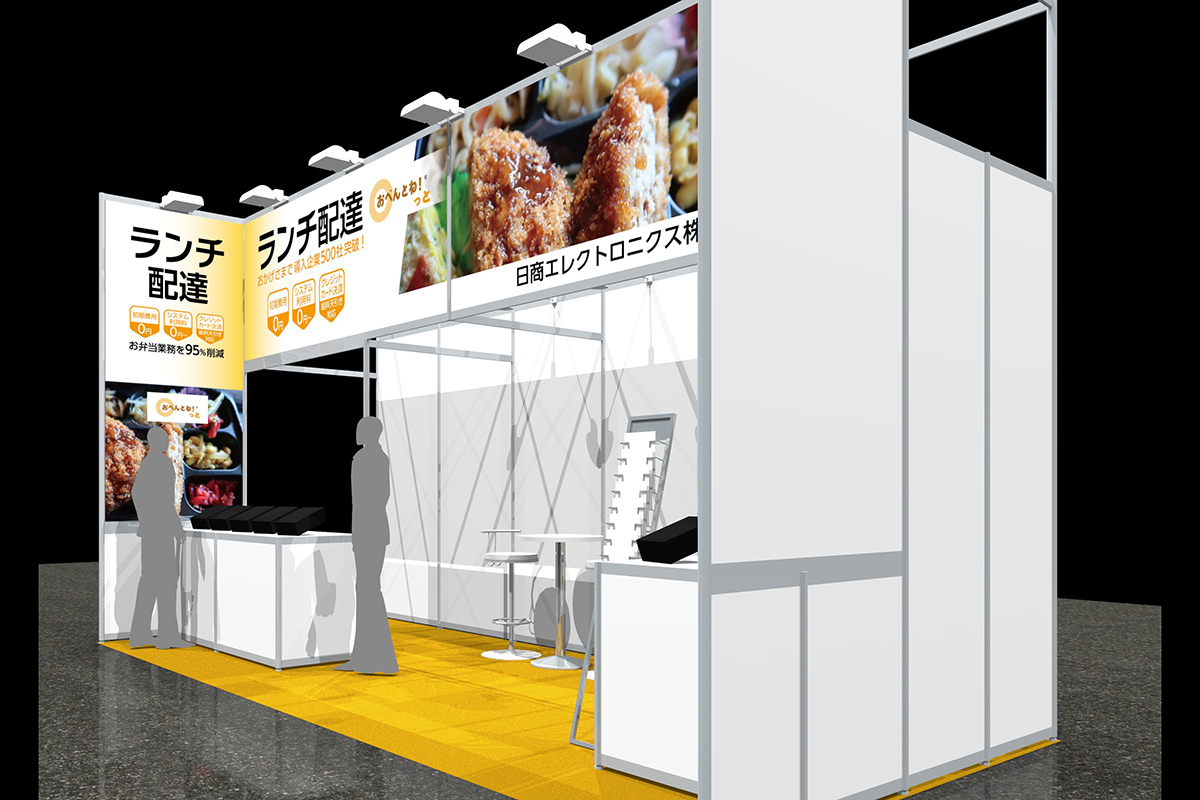 6m×2.7mの3面開放ブースで、「ランチ宅配サービス」の展示です。