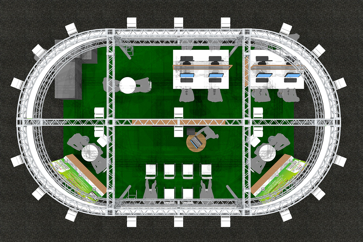 独立小間形状(ブースに接する隣接出展者が居ない)で横幅9000mm×奥行6000mm×高3600mmというブースサイズになります。ホール内の大通りに面している場所なので、上部のラウンド型の看板が非常に有効になりました。