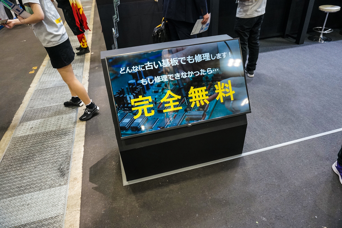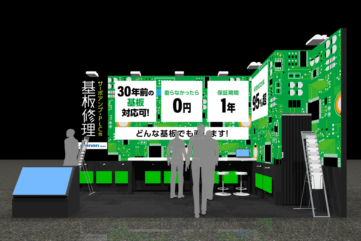 出展社様の商材は工場の装置や業務用機器の基板修理サービスです。図面の無いどんな基板でも修理が可能で、故障し動かなくなった装置を再び使用できる状態にするので、高価な設備を買い替えずに済みます。