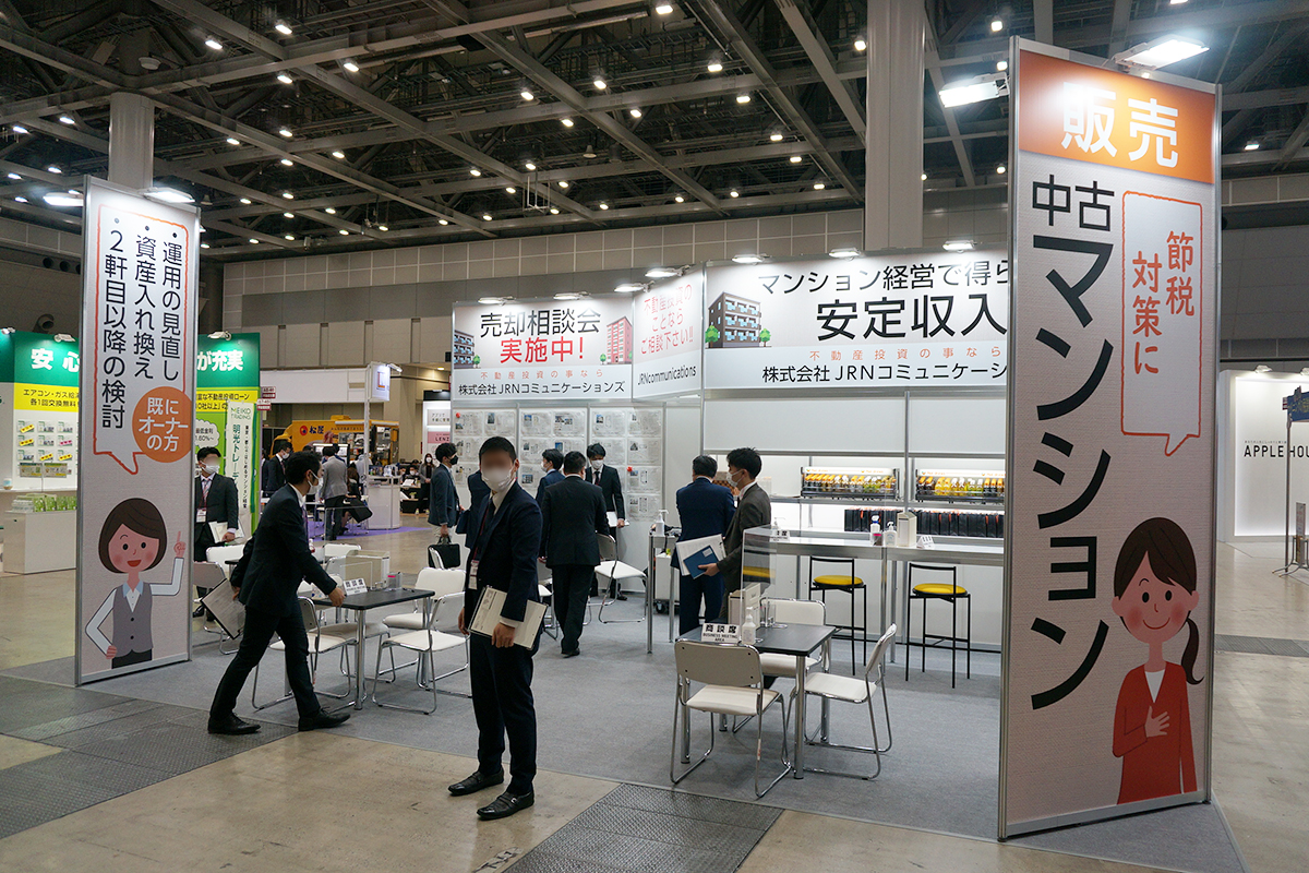 様々な運用に関する出展ブースがある中で「中古マンション投資・販売」と大きく看板を出すことで来場者に商材を分かり易く訴求しています。
