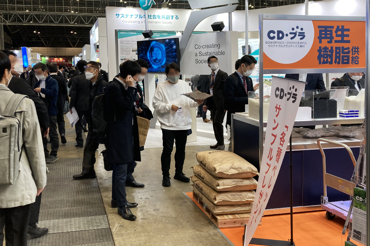 ご出展社様は「♪本を売るなら~」でおなじみ、知らない人はいないのではないか?というくらい知名度の高い企業です。商材はご出展社様で廃棄されるCD・DVDから再生されるプラスチック資材です。