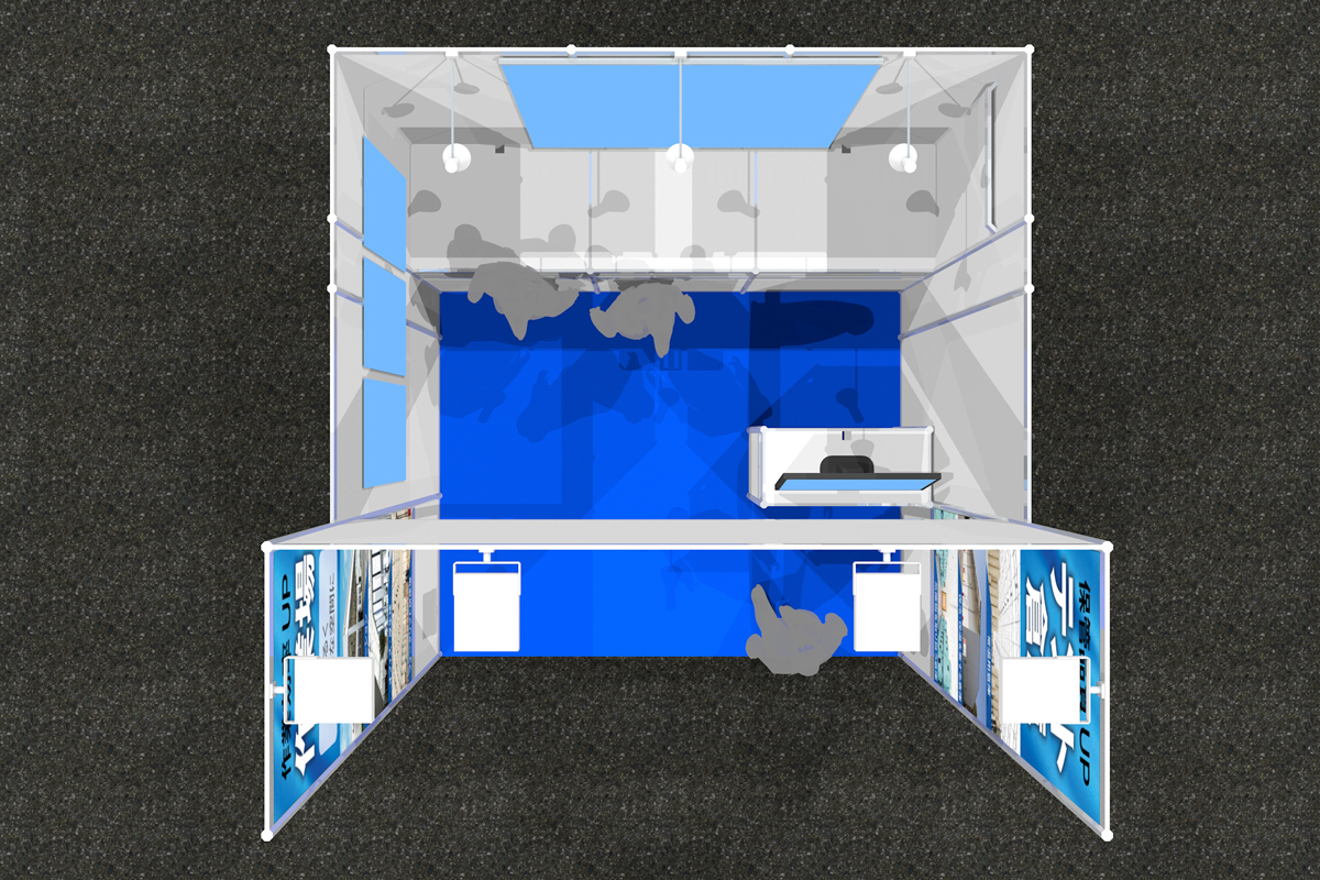 ブースでは来場者が最初に目にする両袖の縦型看板に「テント倉庫・作業場」と表示しサービスについて訴求しています。更に事例写真も有効活用し来場者に対して商材をイメージさせやすくしています。そして来場者がブースに近づくと、上部の看板に表示されている導入メリットの文言が目に入り商材の理解を促します。
