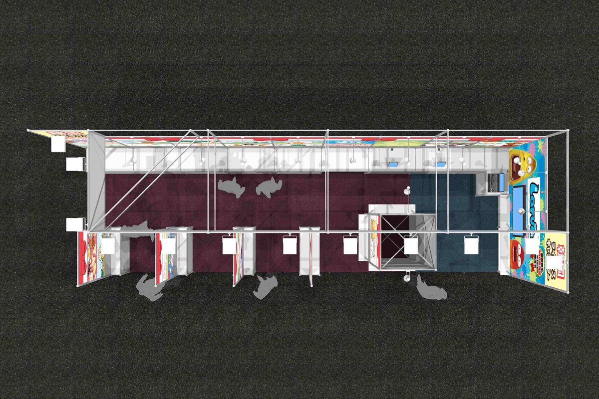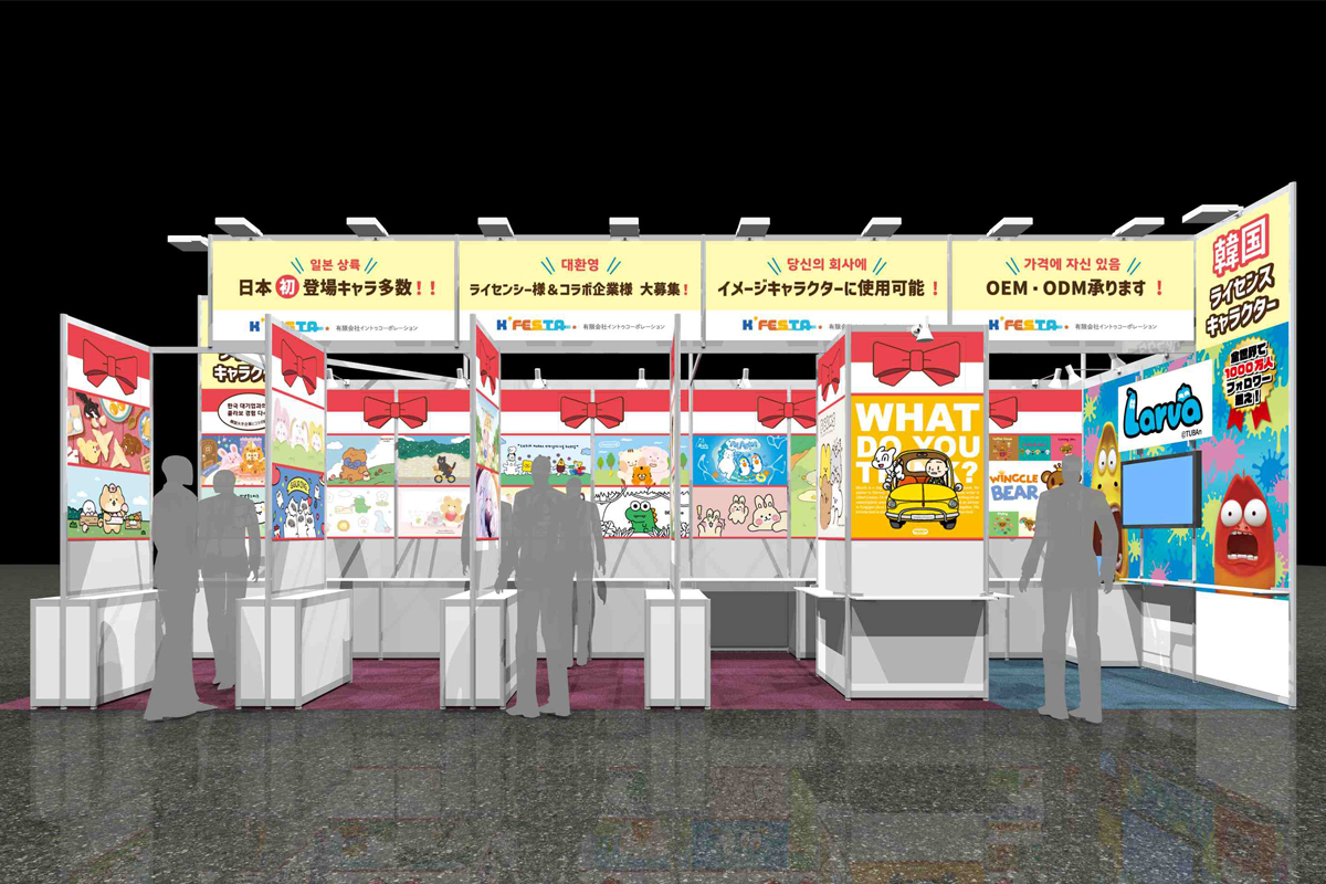 ご出展社様の商材は「韓国ライセンスキャラクター」です。韓国の作家さんのキャラクターや動画など多数のラインナップが商材となります。弊社では通常、通路に面する縦型看板では「出展商材は何か」を、なるべく大きな文字で表示し通路の遠目からでも視認できるようにしています。また上部の看板も面積を大きく取り、通路からでもパッとみて導入メリットが分かるように表示しています。この事例では各作家さんのイラストがメインとなるためイラストスペースをなるべく多く取り、文言での訴求スペースはやや控えめにしています。ただし、文言を入れないと「何を出展しているか」「導入メリットは何か」が来場者には伝わりません。来場者に出展商材をわかってもらうためにも、文言での訴求は重要になってきます。ブースの造作は通路際とブース奥の壁面にキャラクターがずらりと並びます。ブースの奥にも入りやすいように通路際のイラストの間隔などを考慮してブースのレイアウトを行っています。各イラストの上に貼りつけているリボンはスチレンパネルを型抜きしています。ご出展社様からのご要望ですが「こういうことをしたいのだが…」とご要望を頂ければ、弊社からも「このようなものはいかがですか?」とご提案いたしますので、アイデアがありましたら、お気軽にお申し付けください。