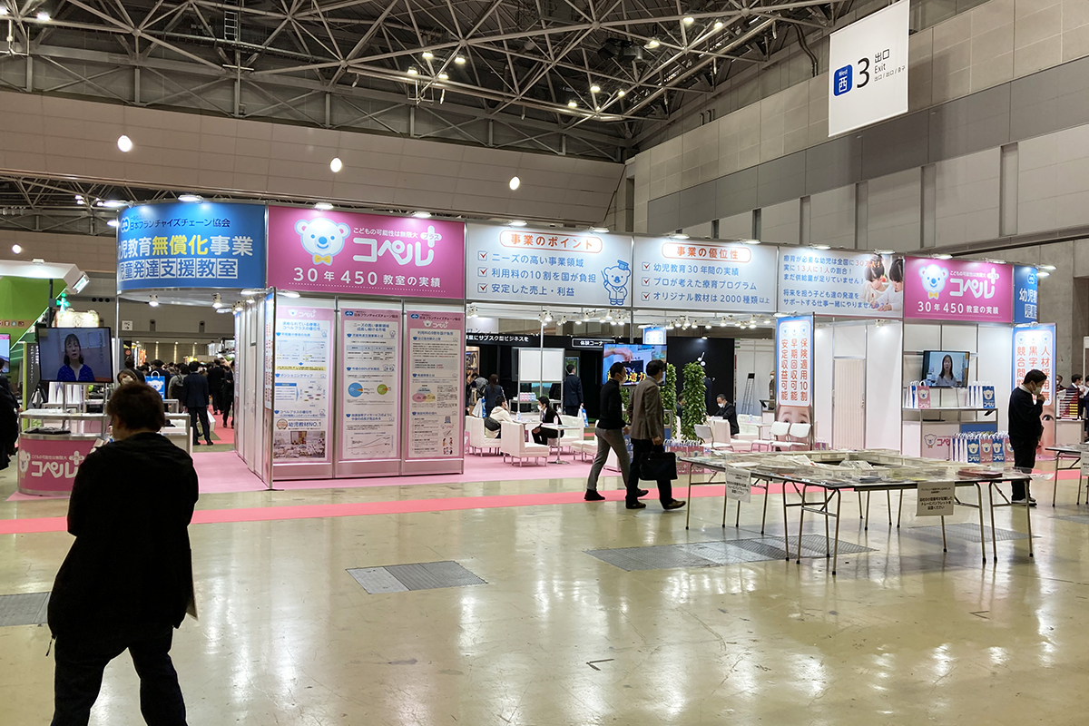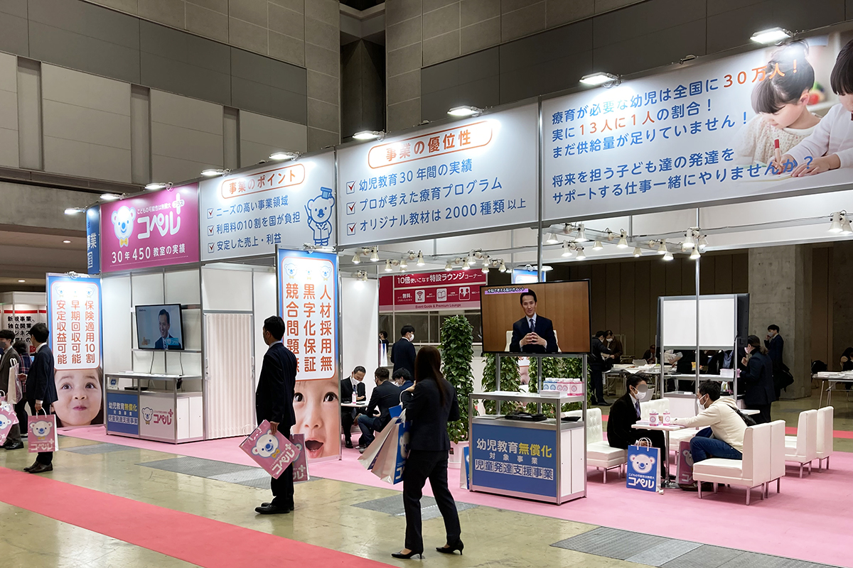 日経メッセ内のフランチャイズ・ショーにご出展されたお客様のブース事例です。横幅21メートル・奥行6メートルというかなり大型サイズのブースです。こういった大型ブースの場合はアルミトラスや木工造作が好まれるのですが、オクタノルムでも十分に対応が可能です。