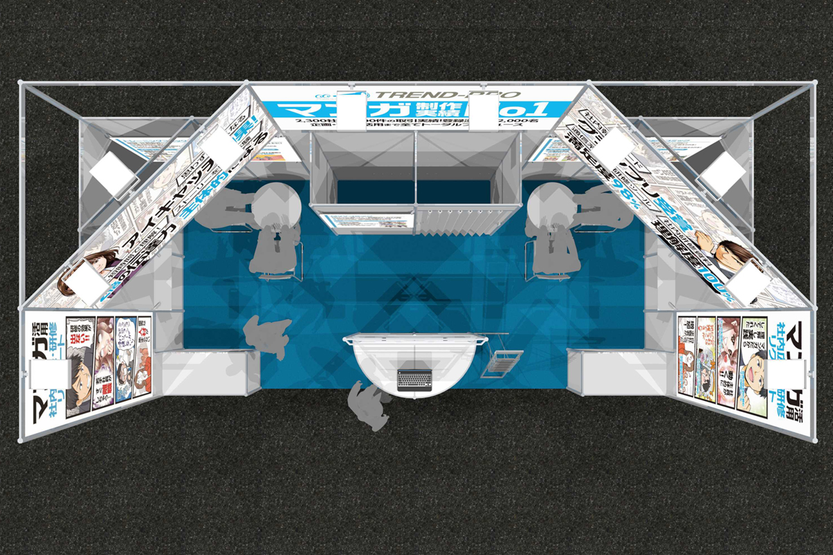 ブースの目の前に立った時に注目する横看板には出展者様の強みである「マンガ制作実績No1」と数ある「実績」と「数値」を上部にもしっかりと商材を訴求した看板を配置することで来場者がブースを通り過ぎる間の3秒間に、的確に情報を伝達することが可能となります。