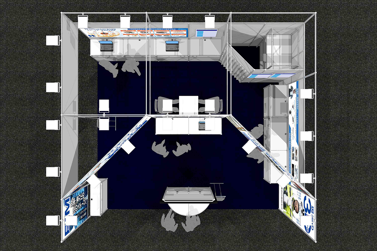 上記の通り、展示会場の外周に面しているため、ブース前方の通路の通行量は多いことが予想されました。左右いずれの方向からの視認性も大切なので、ブース両袖に高さ3.6mの縦方向の看板を入れることで、来場者に出展サービスを強く訴求することを意識しました。上部横方向の看板は八の字型の形状を採用し、看板面積をなるべく広く確保することと、ブースの奥行を強調する効果を狙っています。