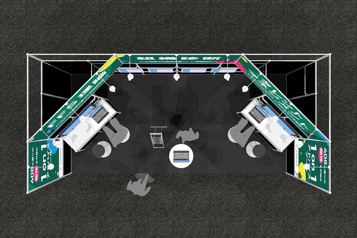 事例のブースサイズは6m×2.7m、両隣が他社ブースに挟まれた中小間の出展場所です。