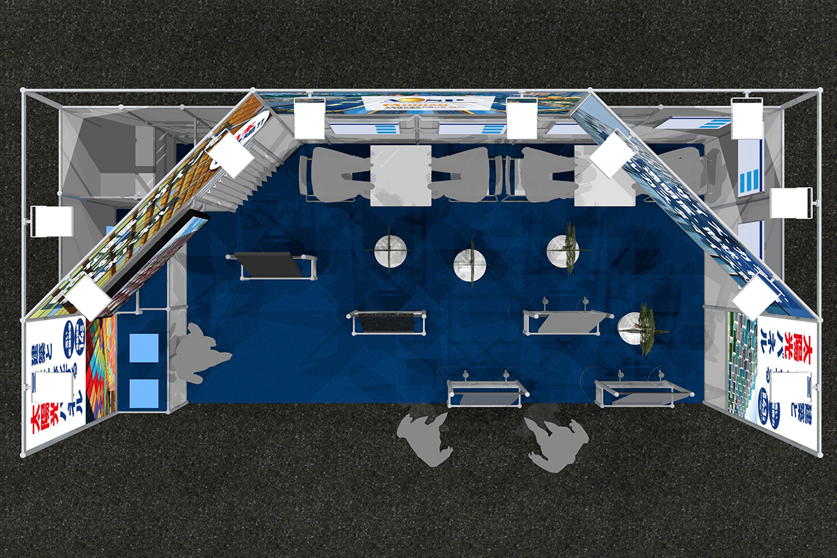 こちらの出展社様は、SMART ENERGY WEEK内のPV EXPO(太陽光発電展)にご出展されており、小間サイズは6m×2.7m、両隣に他の出展社様のブースがいる、通称「中小間」と呼んでいる小間条件です。