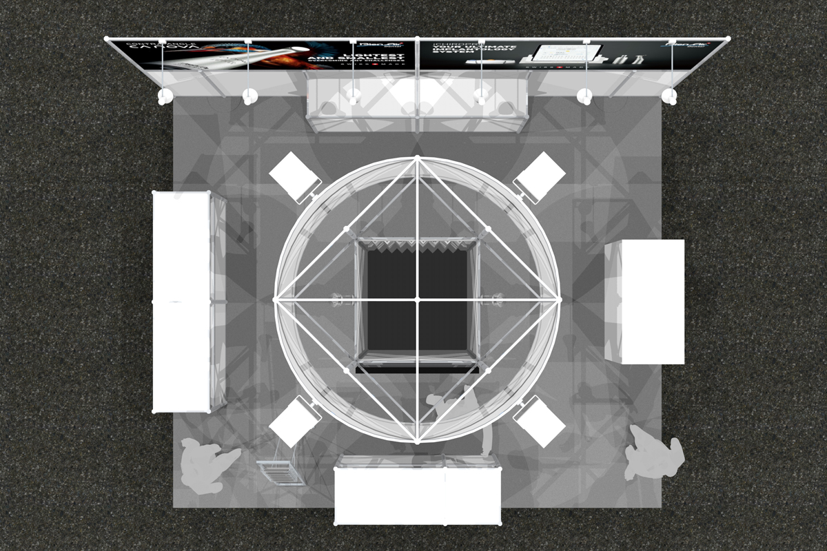 お客様のブースの大きさは4.8m×4.05mで左右と正面が開放されている3面解放という小間位置になります。
