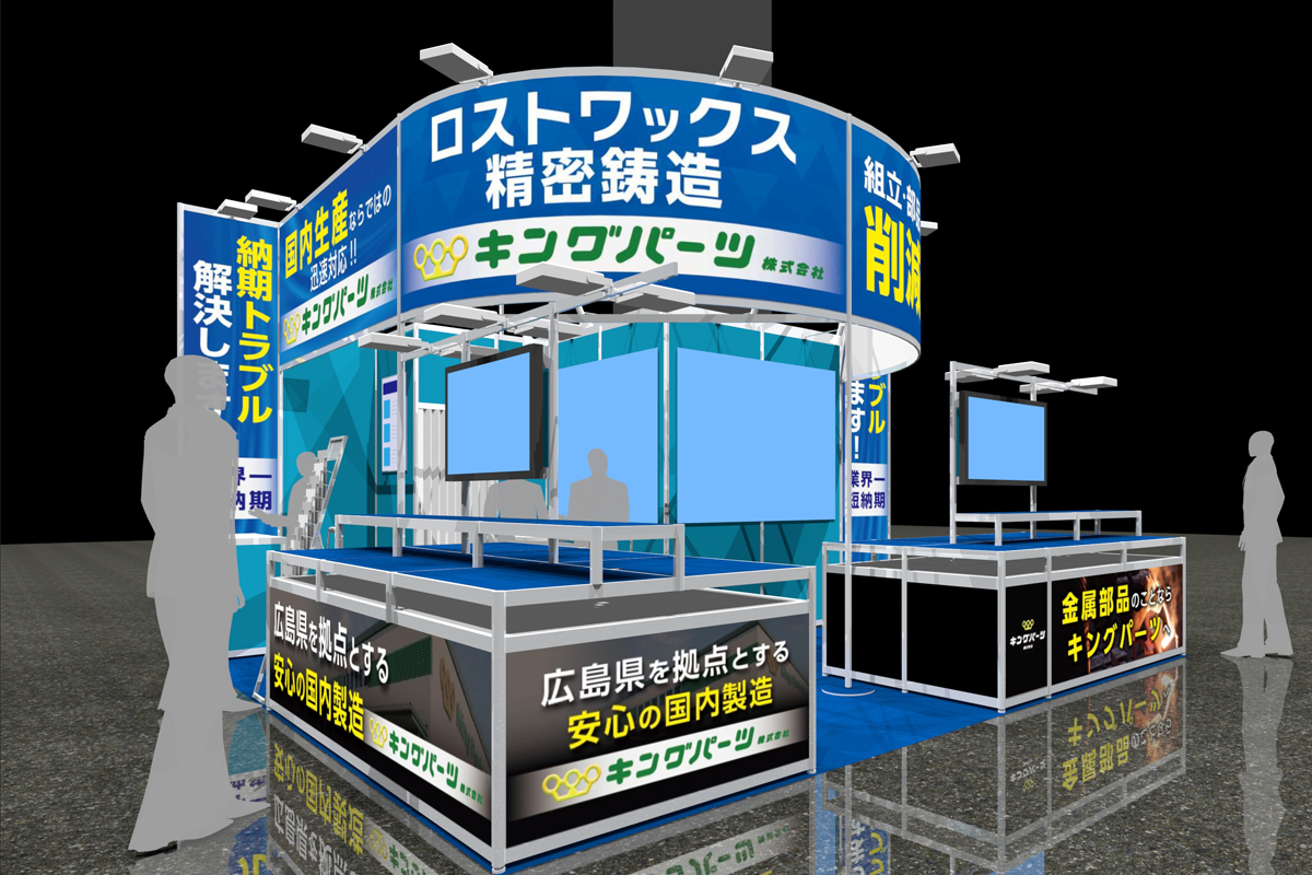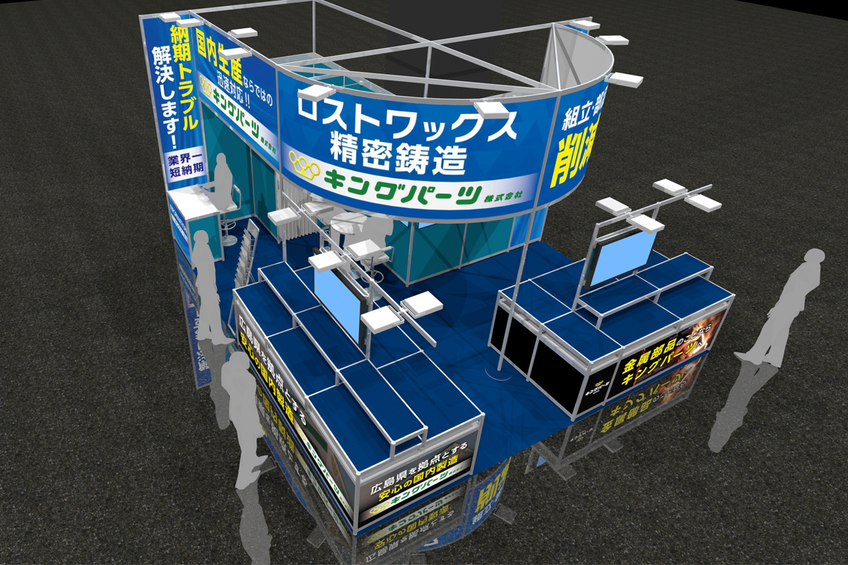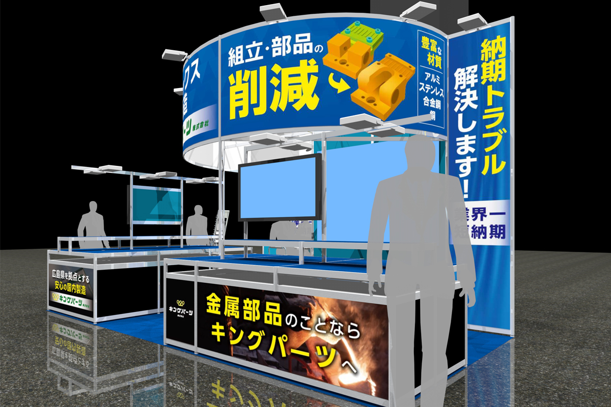 ブースの開放面の位置に通路に添った展示台を設置し、出展製品を置く事でターゲットに合った来場者との商談が可能となります。また、展示台は全て収納付きとなりカタログスタンドスタンドの役割になるよう展示台は3段タイプにする事でブースを広く使う事が可能です。出展製品を多く展示が可能なため、展示台上部に液晶ディスプレイを設置し足を止めることで製品を見ながら商談をする事が可能なスペースとなります。