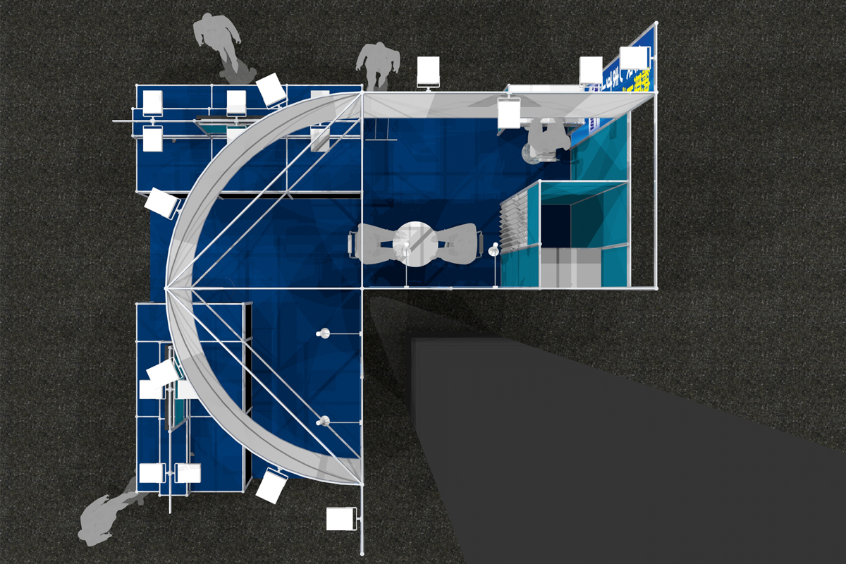今回ご出展された小間サイズが6m×5.4m。3面開放の小間位置です。装飾既定の高さ3.6mとなりますが、正面右奥に会場の柱があることでL字の造作となります。