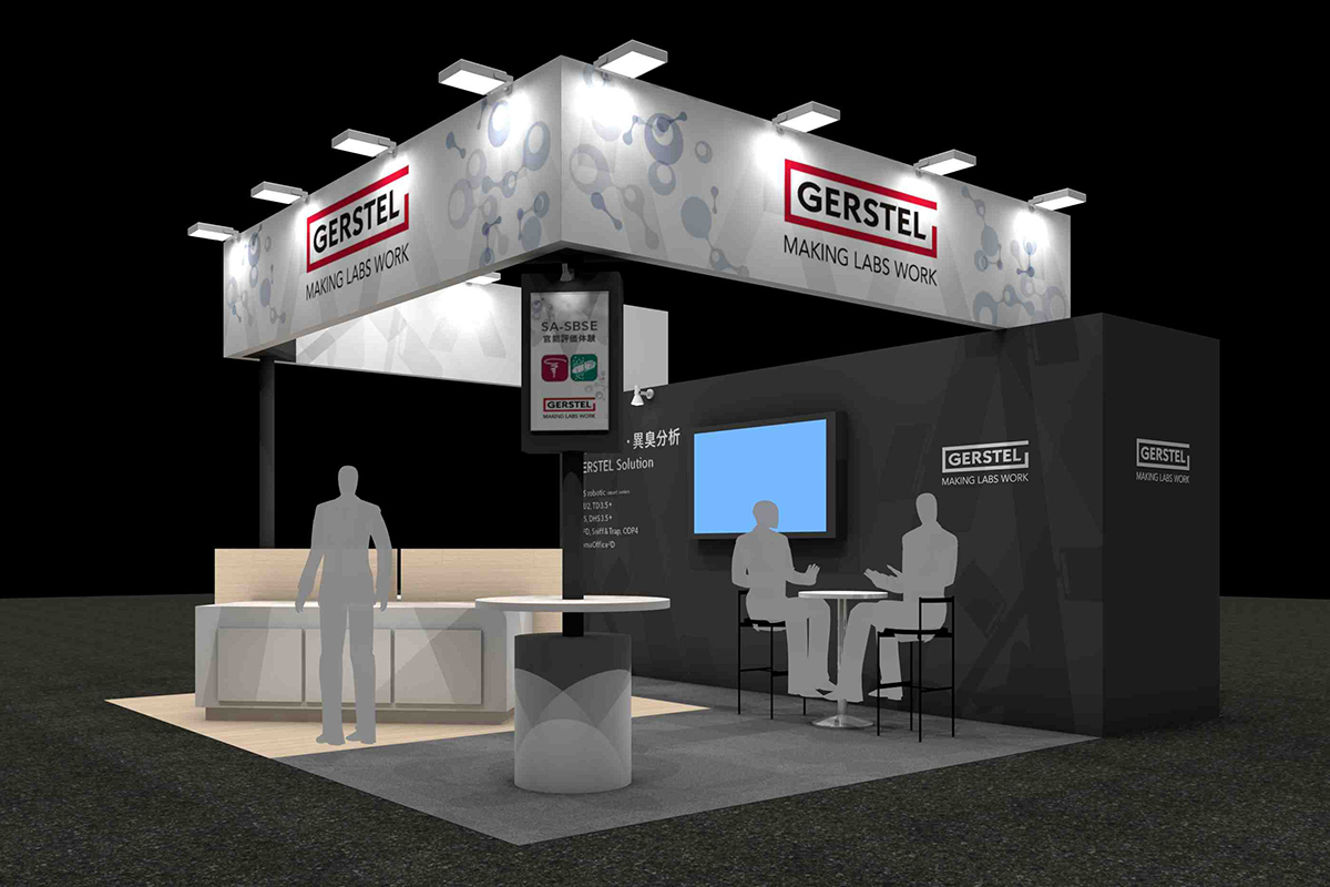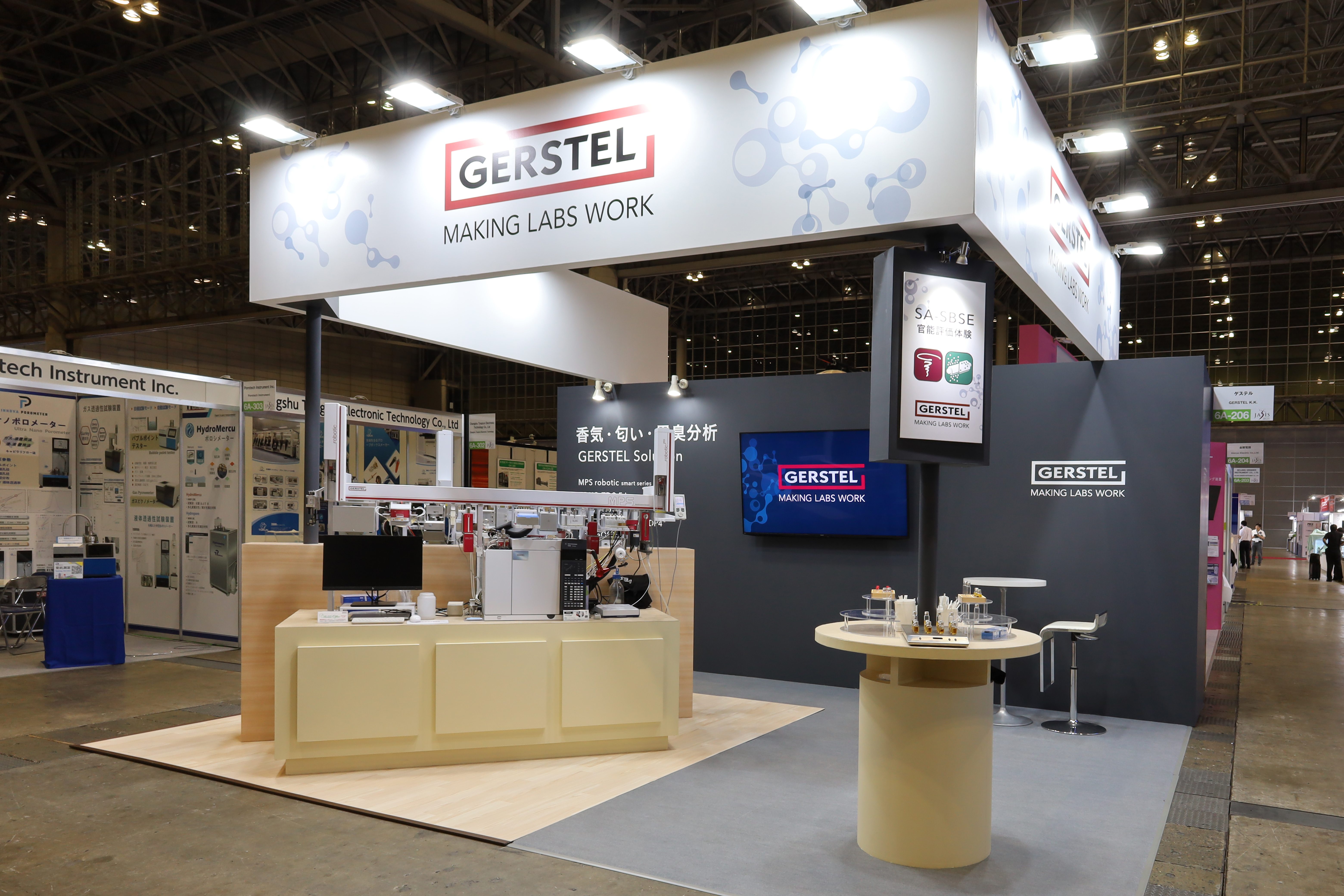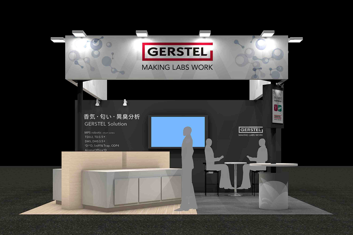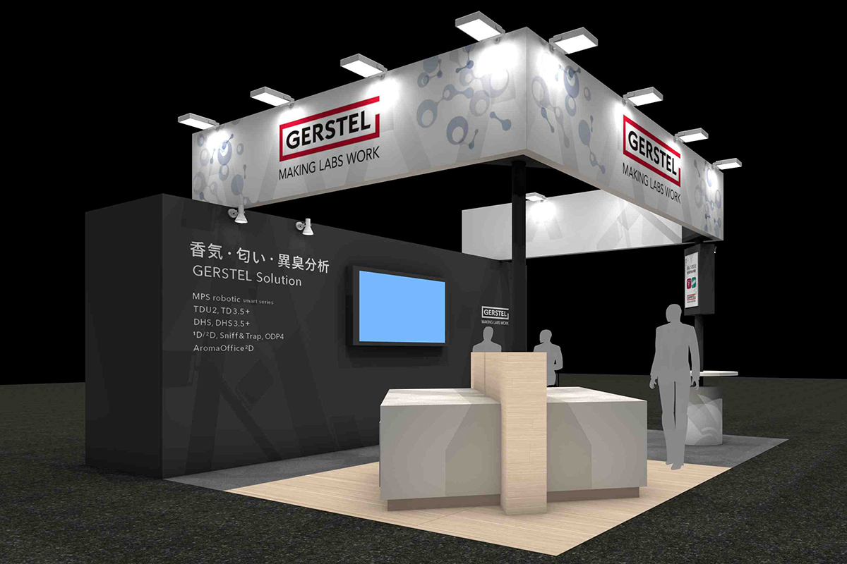 こちらの小間では機器の展示、臭気を体験、商談という3つの構成でブースレイアウトを構成しています。