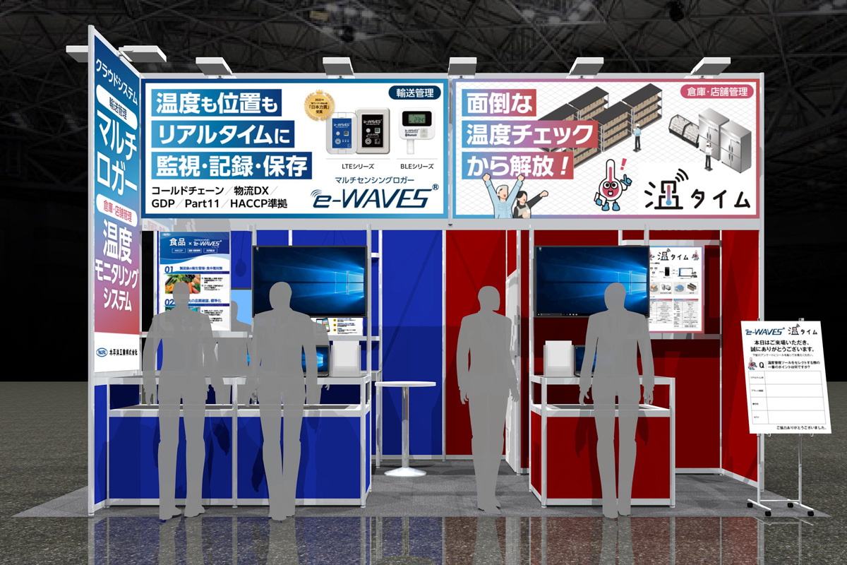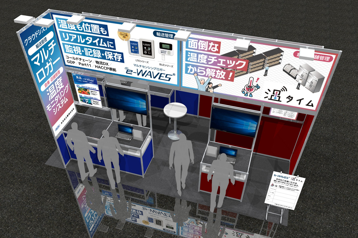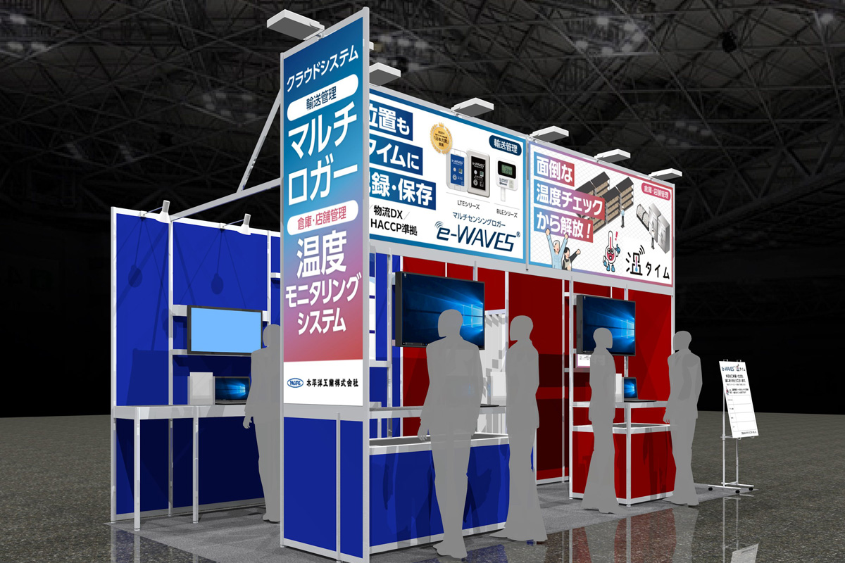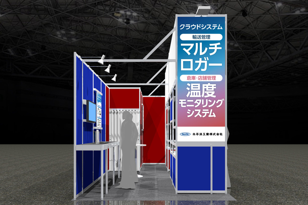出展商材が2つのため、通路に面した縦型の看板で「輸送管理マルチロガー」「倉庫・店舗管理温度モニタリングシステム」と出展商材を教示しています。また壁面の色を青と赤の2つに分け、商材のゾーン分けを行っています。導入メリットなどを表示する上部の看板はデザインを揃え、統一感を出すようにしています。