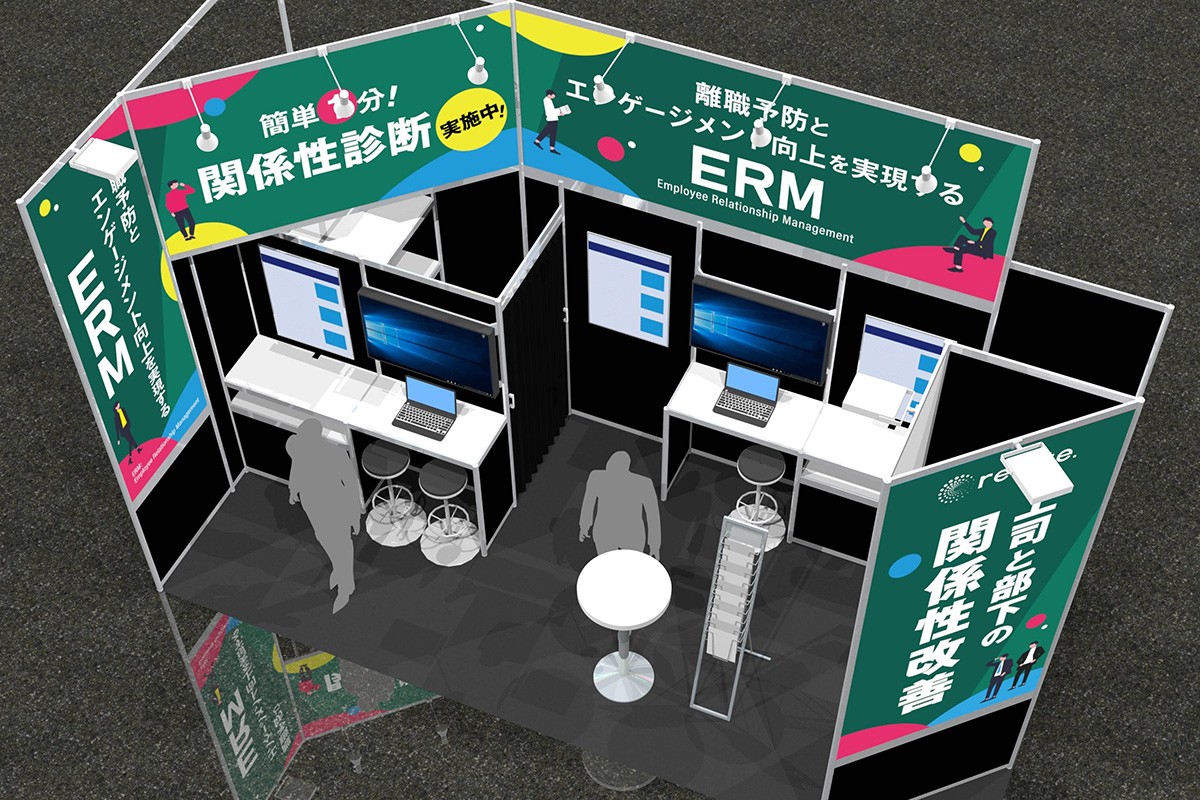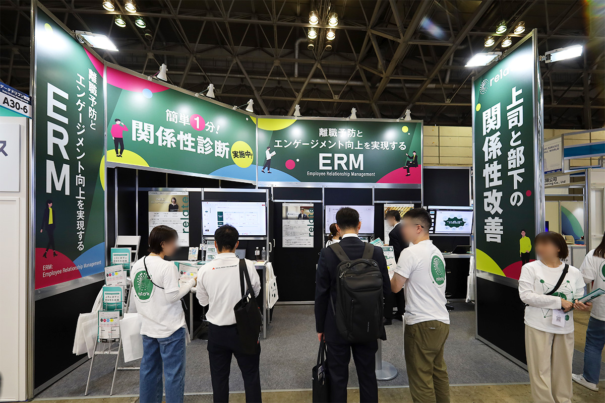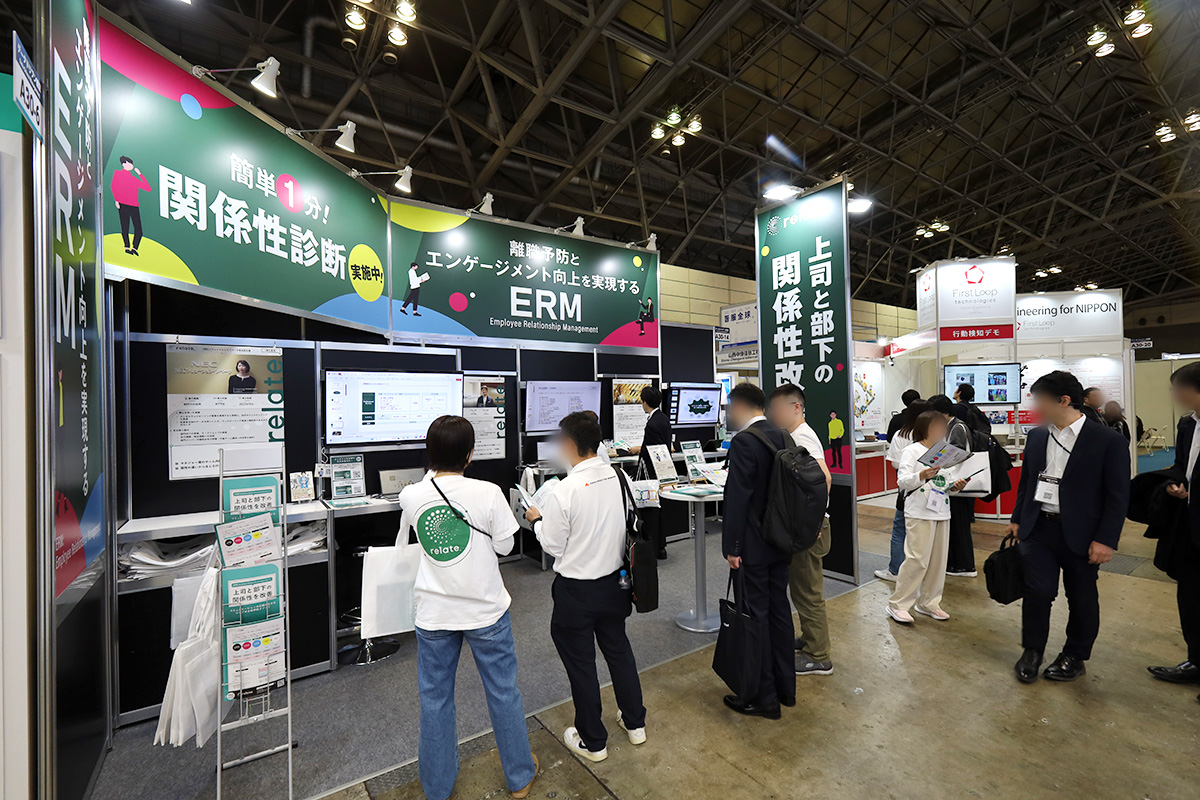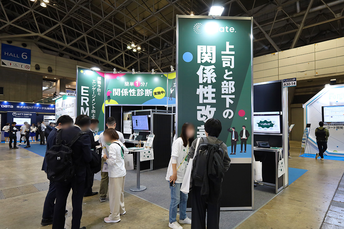 ストレスと性格の研究のなかで開発された「FFS(Five Factors & Stress)理論」に基づき、社内の人間関係改善やチーム最適化を目的としたツールが出展社様の商材です。看板の「上司と部下の関係性」のキャッチコピーが印象的ですね。
