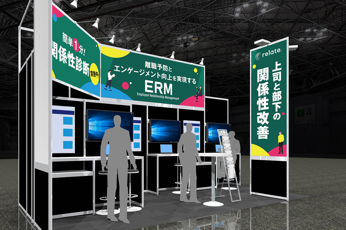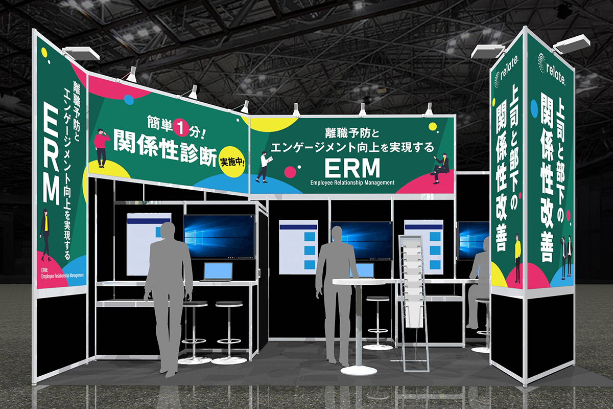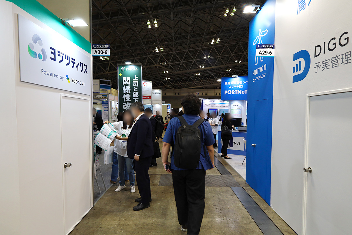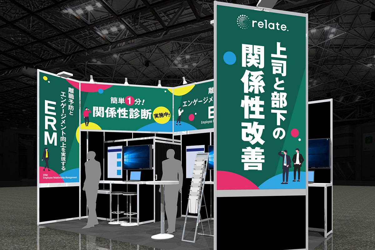 ストレスと性格の研究のなかで開発された「FFS(Five Factors & Stress)理論」に基づき、社内の人間関係改善やチーム最適化を目的としたツールが出展社様の商材です。看板の「上司と部下の関係性」のキャッチコピーが印象的ですね。