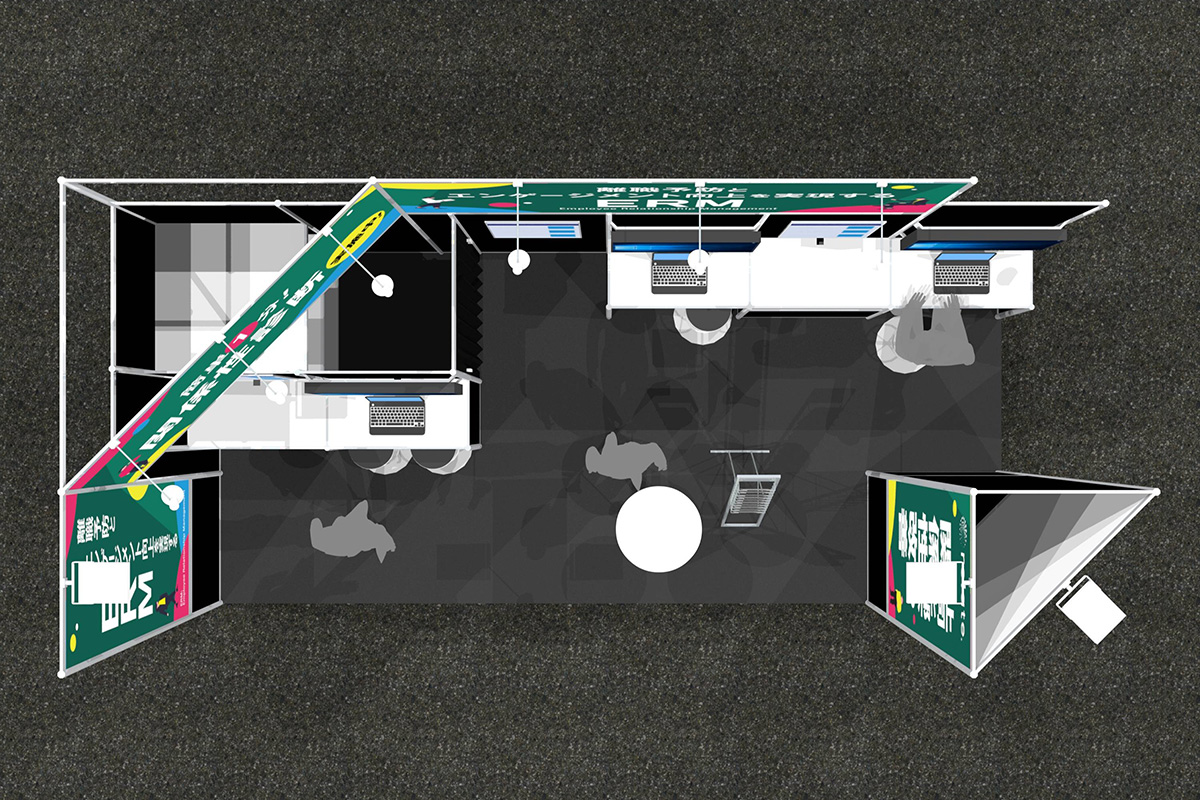 ちなみに、通路に人が溢れた際や接客中に看板が隠れてしまわないよう、人間の身長平均170cmより上になるべく情報を表記しています。来場者がどういう動きをして、ブースをどの角度から見るのか、ということもブースをデザインをする際にとても重要な要素です。