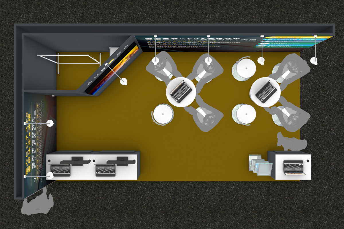今回ご出展された小間サイズが5.4m×3m。2面開放の小間位置です。高さは2.7mとなります。今回はご出展社様のコーポレートカラーに合わせ、シンプルな木工ブースをご提案させていただきました。当社は「集客できるブース装飾」を心がけており木工ブースでも「どんな商材なのか」「導入するメリットは何か」が視認できるよう壁面に商材内容を簡潔にな文言とアイコンを入れたデザインに設計しました。また、右側が開放的な通路のためあえて55インチ液晶ディスプレの配置を斜めにすることで来場者が視認しやすく、左側通路にデモ機を使用した展示台を設置し、右側奥に商談席を設置することでより詳細な商談が可能となるブースとなります。