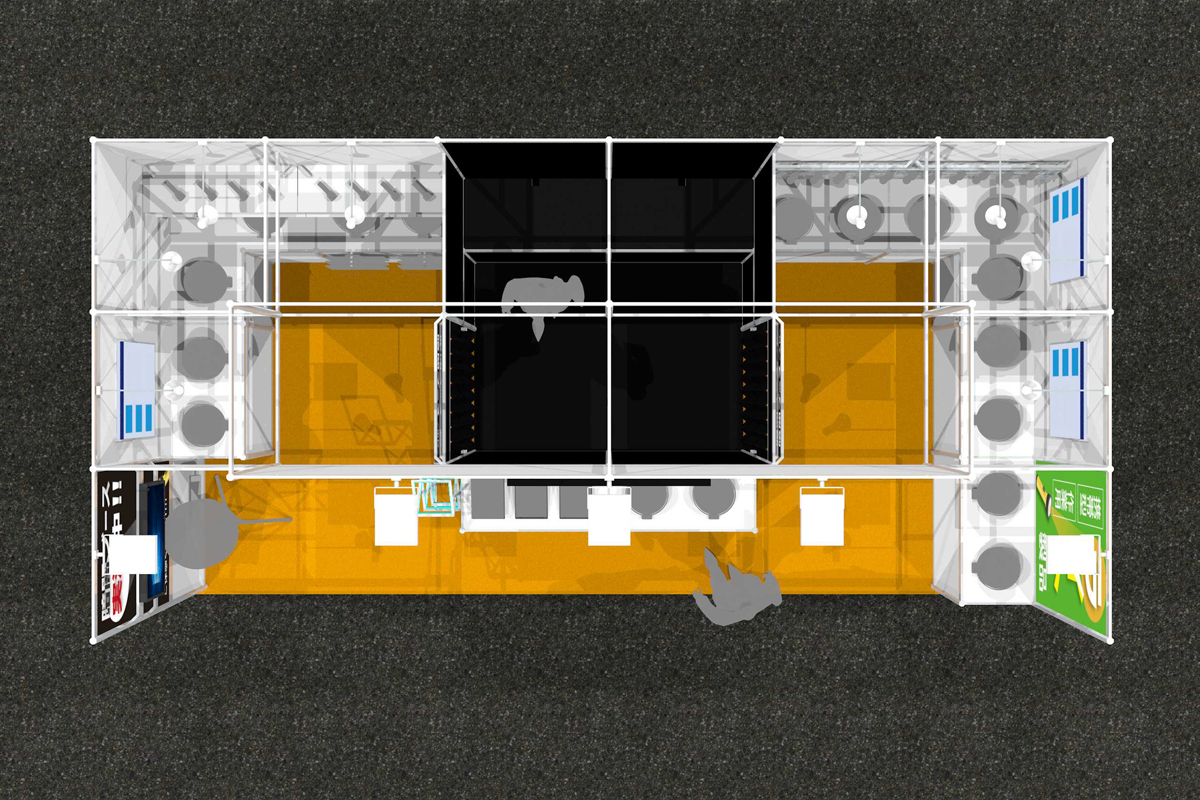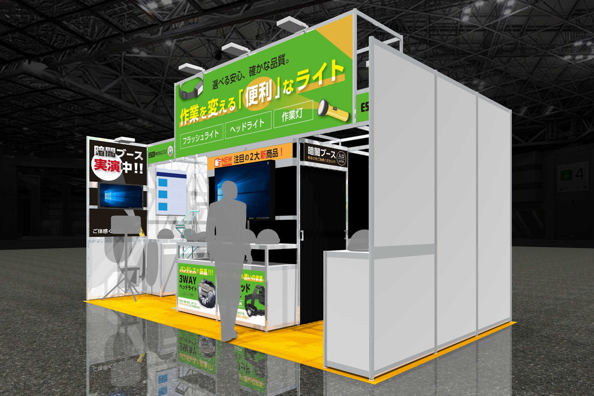 ご出展製品がライトであることから、ブース内にあえて真っ暗な空間を設け、来場者様に製品を手に取って中へ入っていただき、実際の明るさを体感してもらうことを目的としています。暗闇ブースのサイズは約4㎡。四方を黒い壁で囲み、床には当該区画のみ黒のパンチカーペットを採用しました。さらに黒い板で天井を設けることで、外光を極力遮断し、より没入感のある暗闇空間を演出しています。ブース内にはライブカメラを設置し、通路側の立て看板に設置した31.5インチモニターへ、暗闇ブース内の様子を常時映し出す構成になっています。
