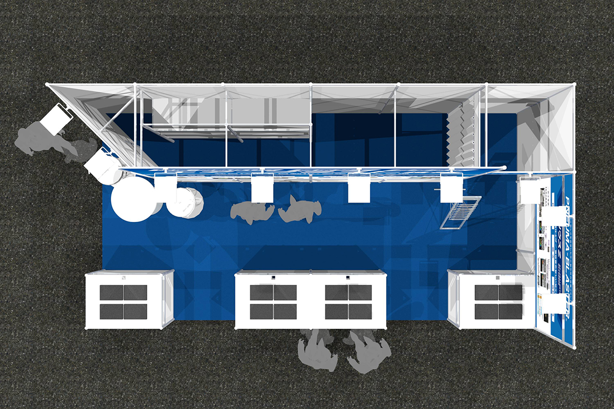 ではなぜこのレイアウトだったのかと言うと、「展示会の装飾規定が、小間境界から1mセットバックしたエリアのみ高さ3.6mまで看板を上げられること」と、「壁面をなるべく多くの来場者に見てほしかったこと」の2点を叶えるためです。