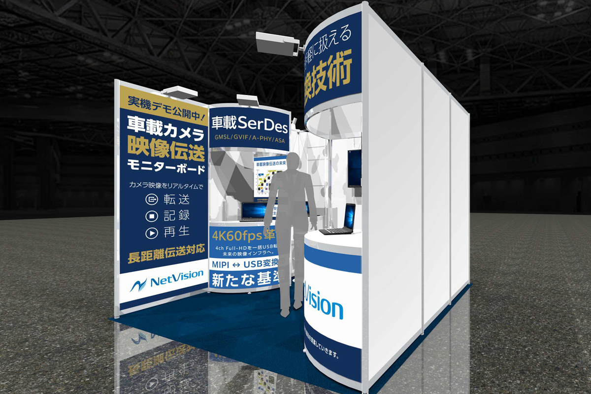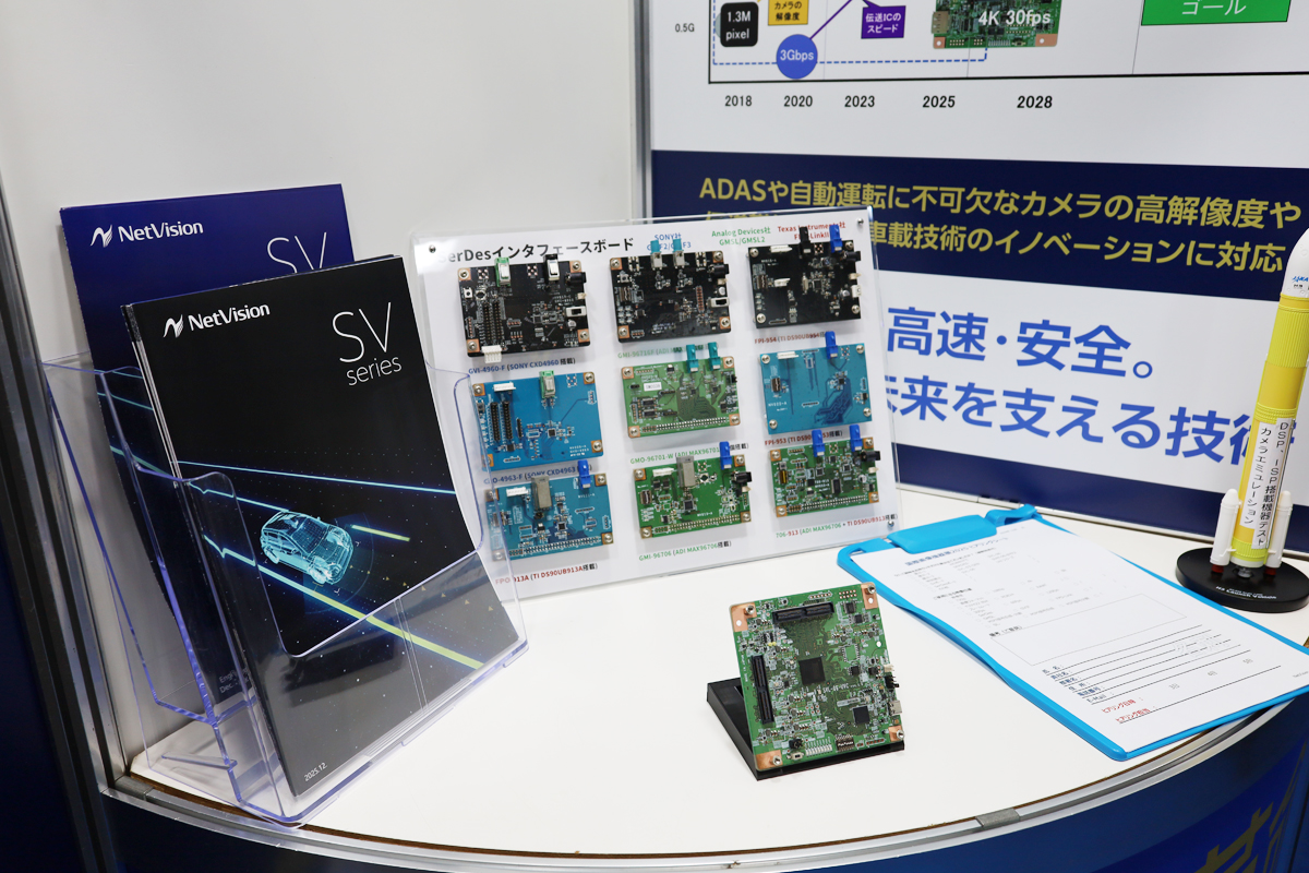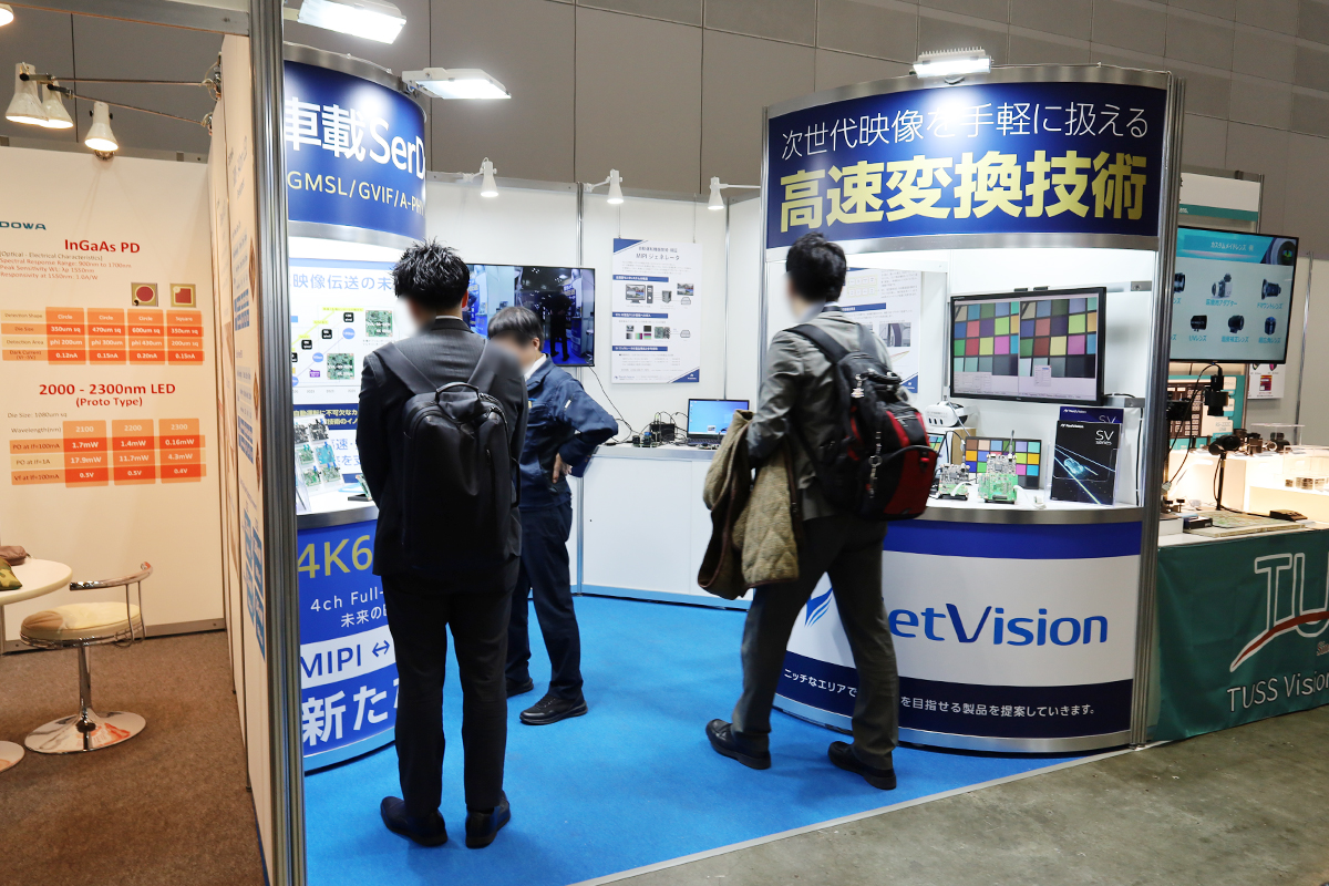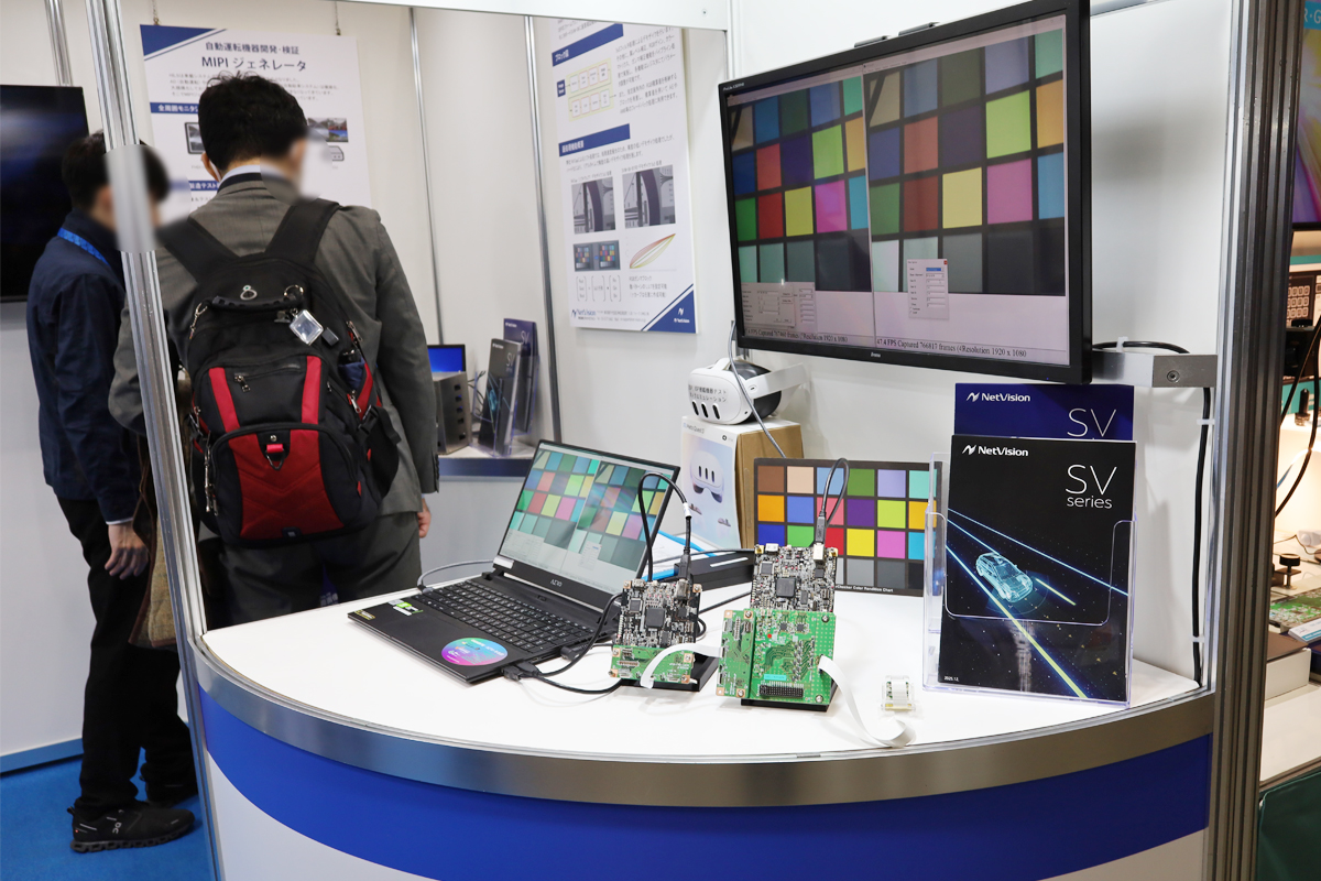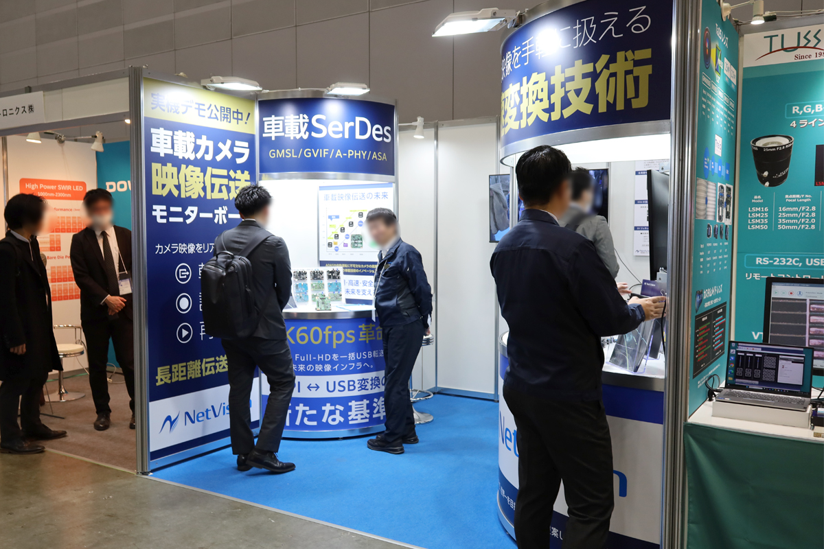 ご出展社様の商材は、「車載カメラ・映像伝送モニターボード」です。こちらの商材は、カメラで撮影した映像をリアルタイムで転送・記録・再生することができるシステムで、高い信頼性と操作性を兼ね備えている点が特長です。ブース内では実機が展示されており、スタッフの方がデモンストレーションを行いながら機能や活用方法について丁寧にご説明されています。