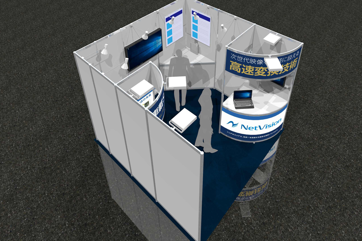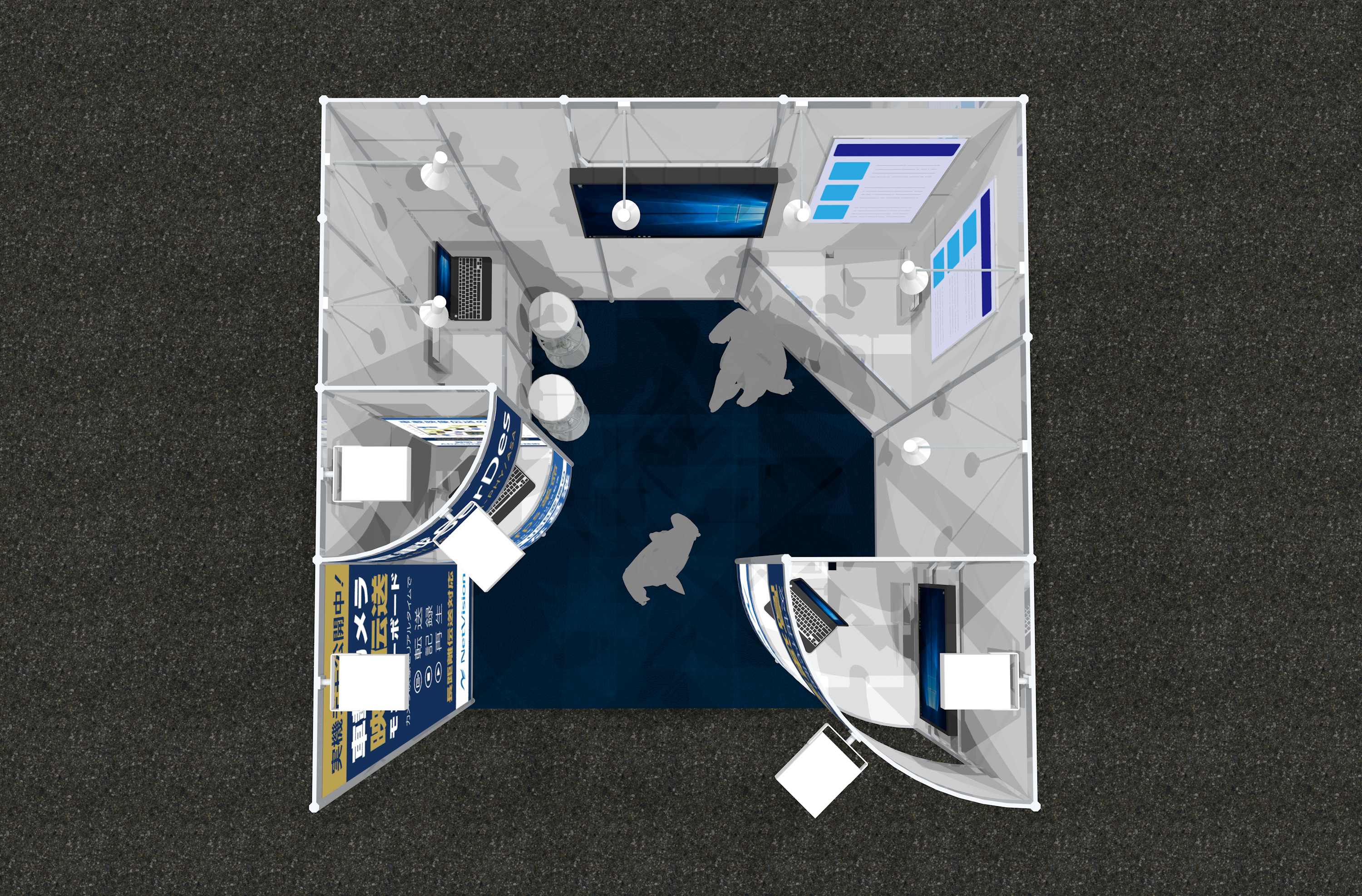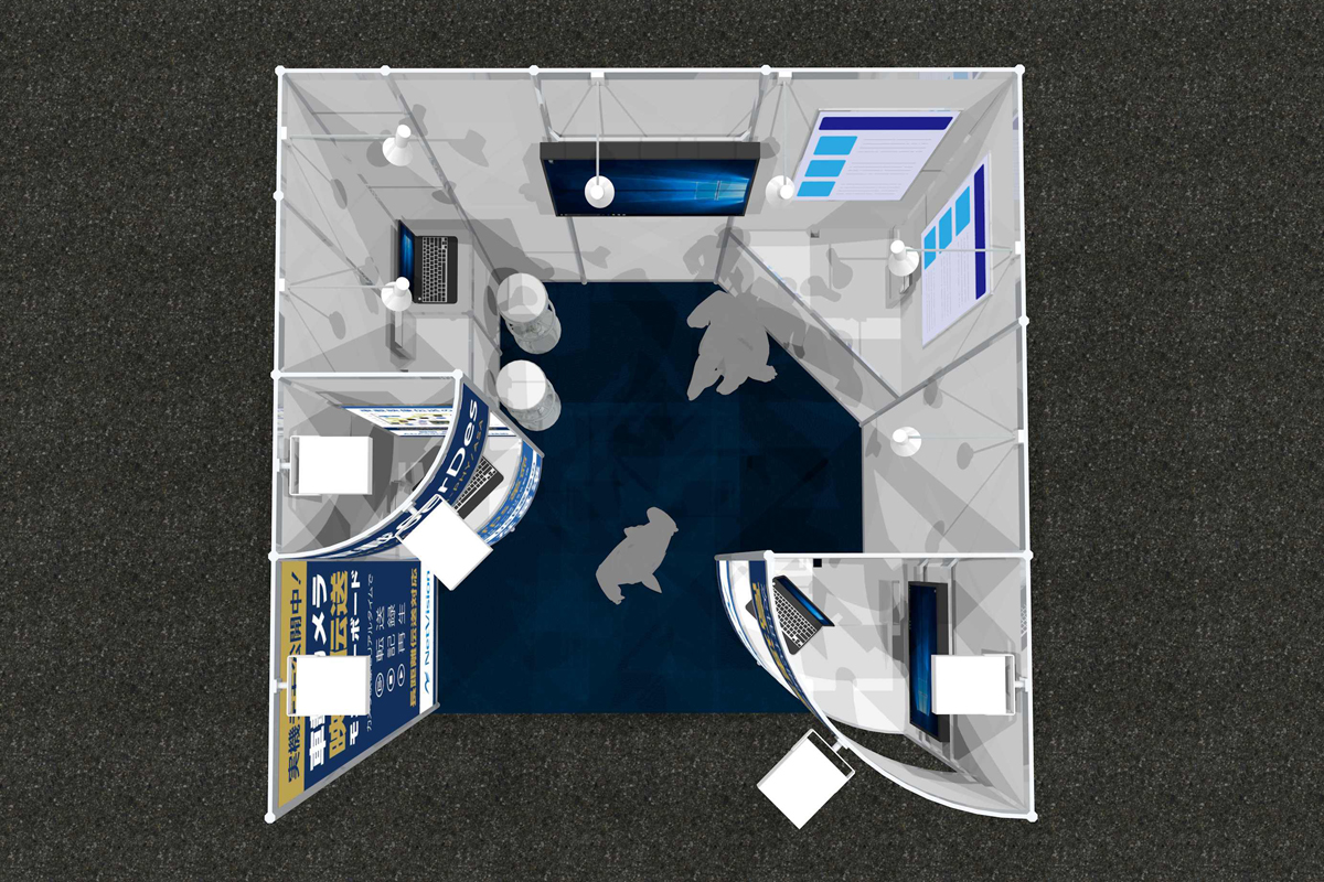 当社では、小間の配置を考慮した最適なデザインをご提案いたします。デザイン費用もお見積りに含まれておりますので、すべてお任せいただけます。会場の条件や開放面、配置に応じた効果的な看板表現を得意としておりますので、展示会での集客を重視されるご出展社様は、ぜひお気軽にご相談ください。