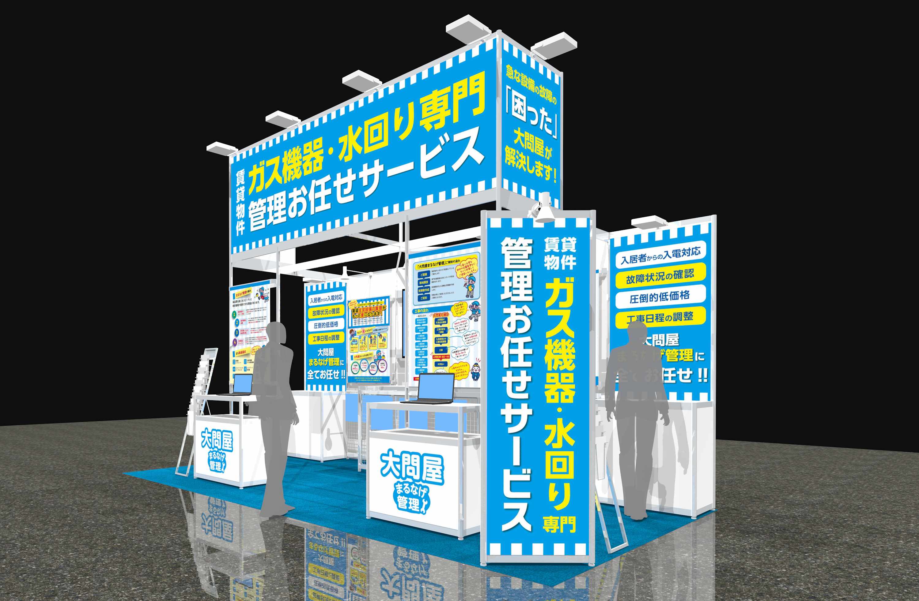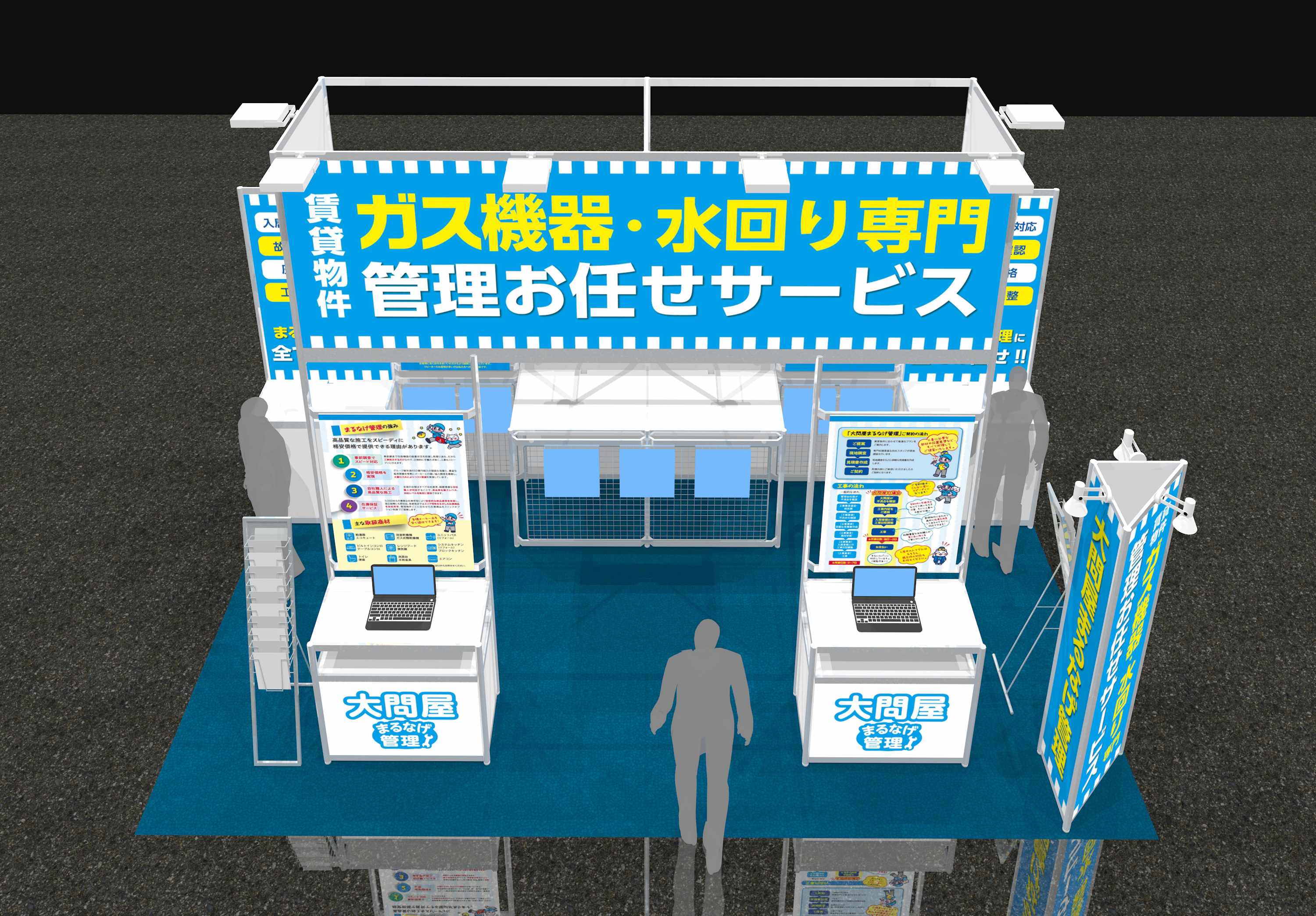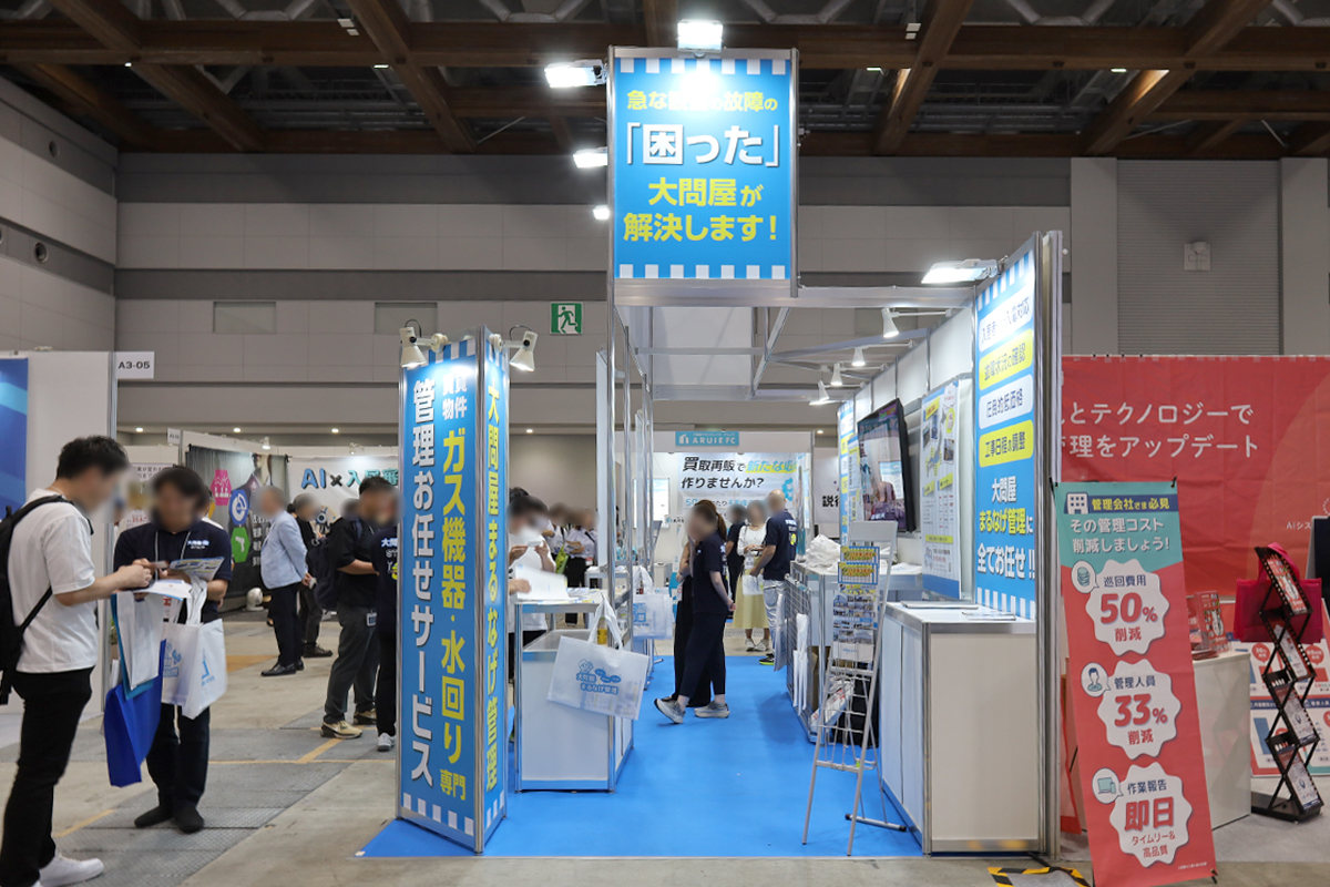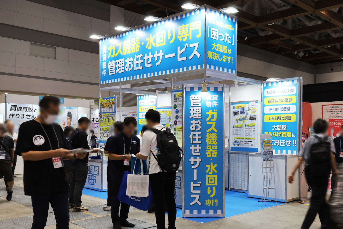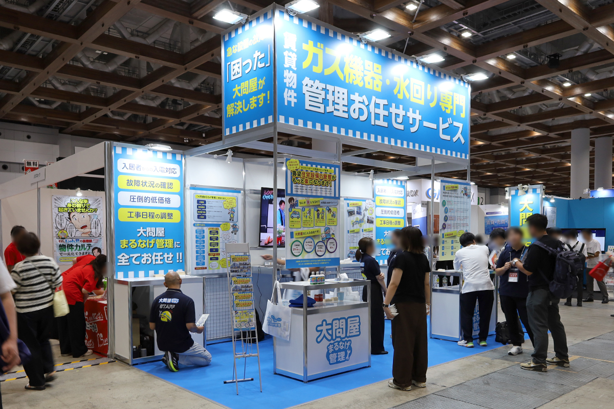 ご出展社様の商材は、賃貸物件のガス機器や水回りに特化した管理代行サービス「大問屋まるなげ管理」です。管理会社・不動産会社・オーナー様を対象に、入居者からの電話対応や故障状況の確認、工事日程の調整までを低価格で一括して任せられる点が大きな特長です。