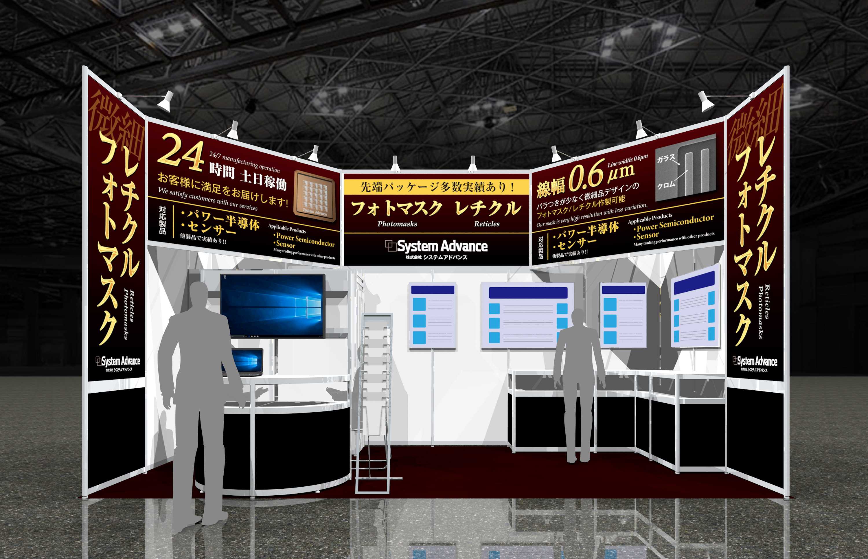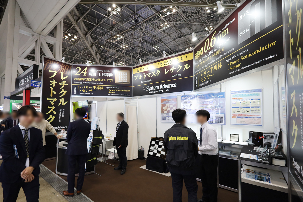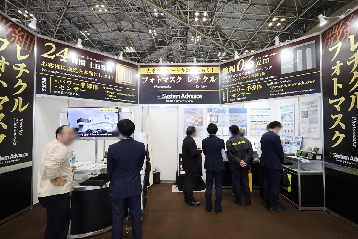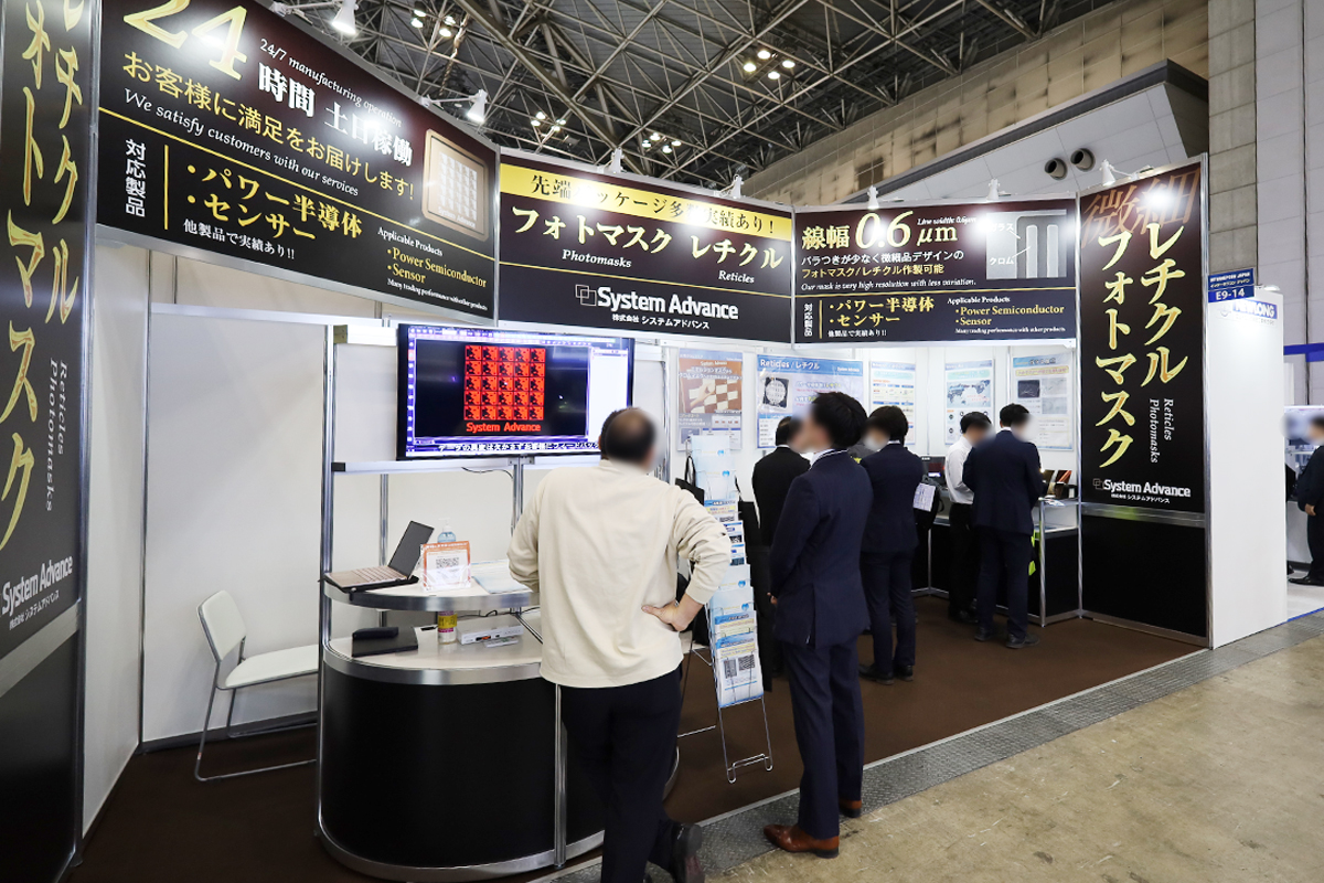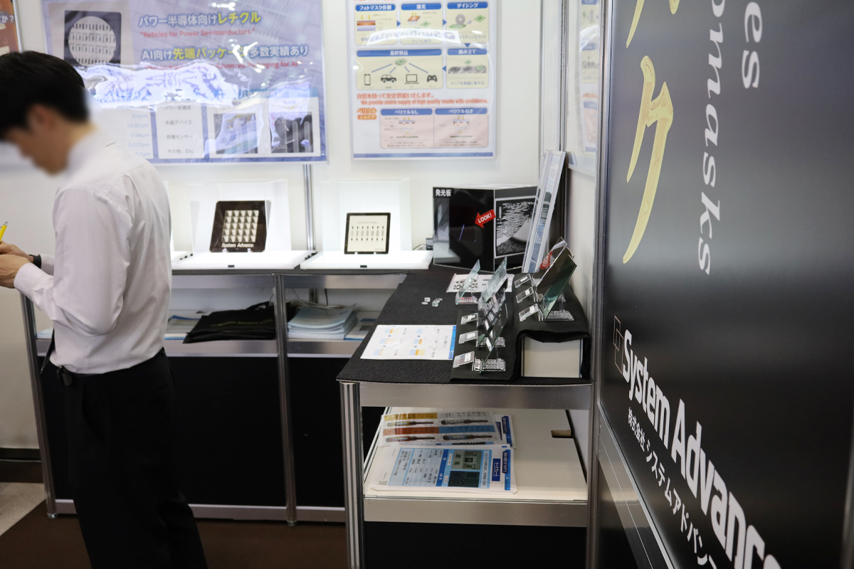 こちらのブースはレチクル・フォトマスクの製造メーカー様です。ご出展社様の商材は、レチクル・フォトマスクとなります。ご商材のフォトマスクは、フィルムマスクからエマルジョンガラスマスク、クロムガラスマスクまで、用途に合わせた幅広いラインナップをご用意しております。高い描画精度と安定した品質を実現しつつ、一貫生産体制により高品質・短納期・低価格を実現しています。