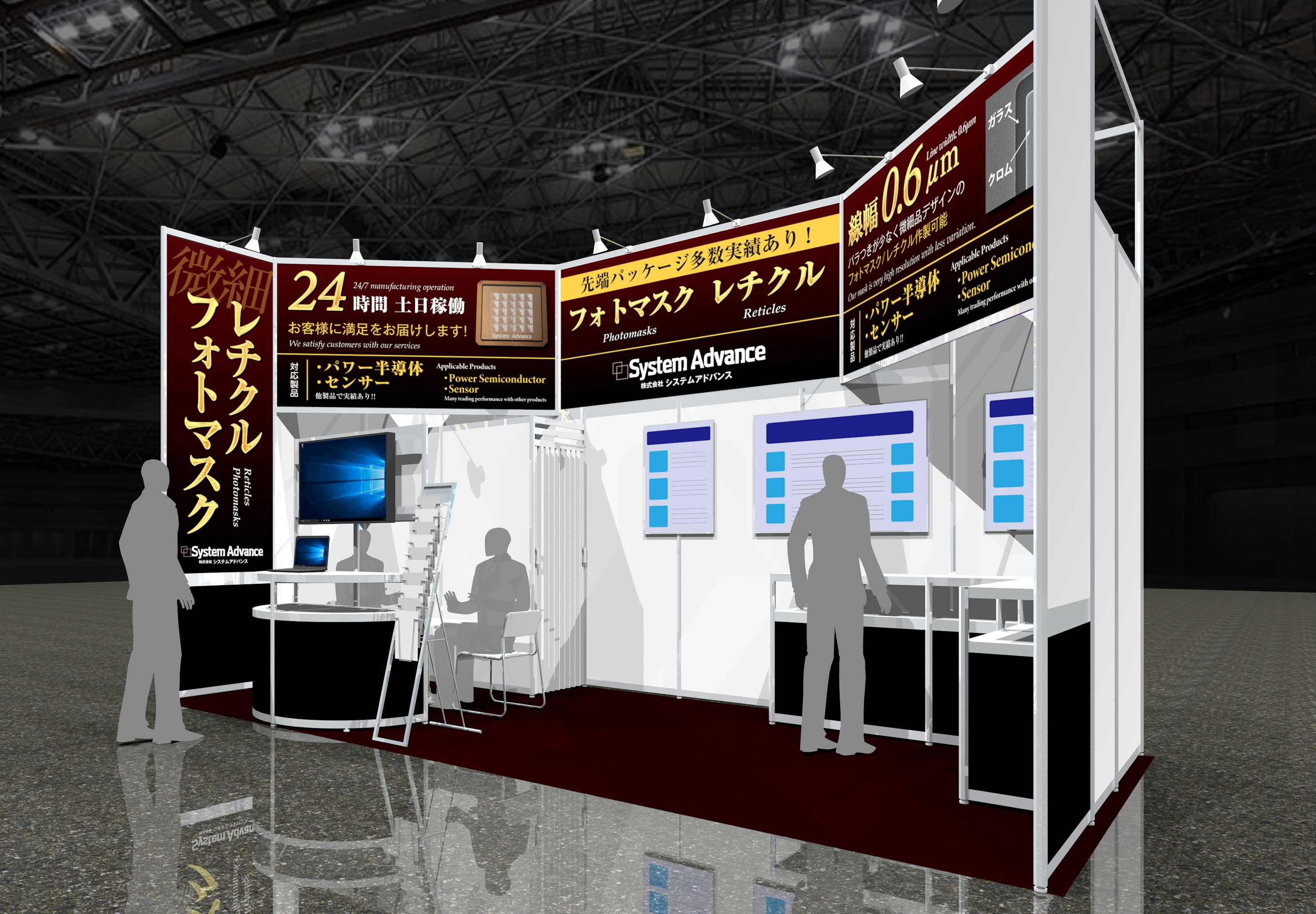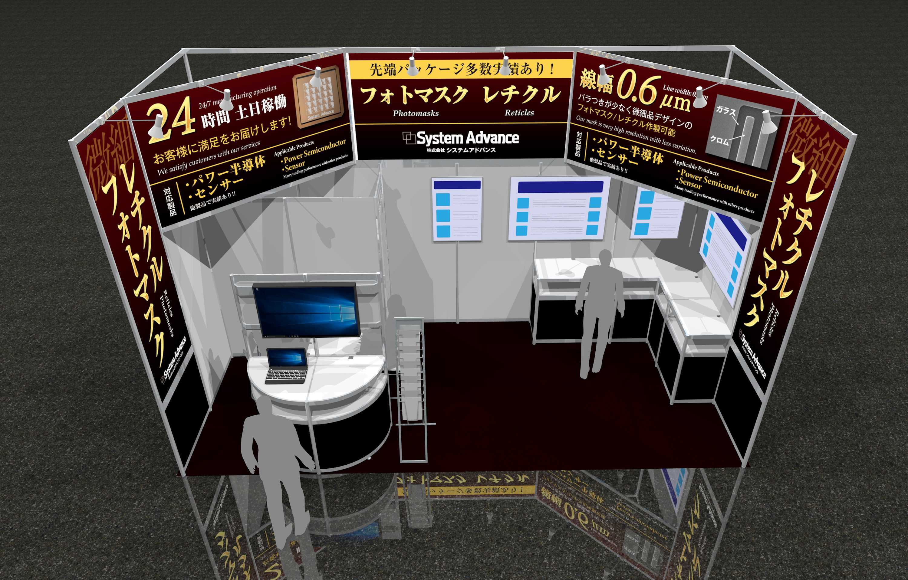 今回の小間位置は1面開放の中小間のため、左右の出展社に挟まれ、前面の通路側のみが開放されたブース形状となります。解放面が1面のみのため来場者との接点が限られ、集客面では不利になりがちです。そのため、正面展示だけではブースの魅力が伝わりにくい場合があります。そこで、側面看板やサインを活用し視認性を向上させました。両サイドに高さのある看板で「レチクル・フォトマスク」と大きく表示することで、斜めからの視認性も高まり、来場者の目を引きやすくなります。また、看板を奥に伸ばすレイアウトによりご商材の詳細説明も可能となりました。限られた解放面を活かした視覚的訴求がポイントとなり、「手応えを感じられる商談ができた」とのお声をいただいております。