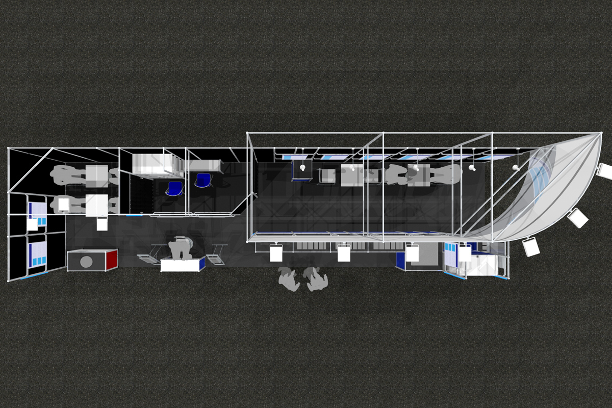 今回ご出展された小間サイズが12m×3m。2面開放の小間位置です。装飾既定の高さは4mの造作となります。最大の高さにすることで、遠くからでも視認できるブースとなりました。今回一部の3×3のエリアのみ共同出展社様との合同出展となり、そのエリアのみ2.7mの高さとなります。