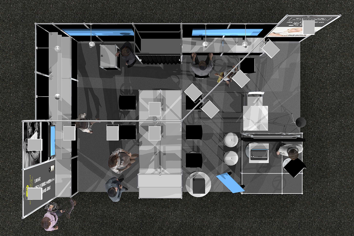 事例のブースはサイズが1.4小間(6m×3.8m)の3面開放で、少し変則的な形状の小間でした。また西ホール内側の天井が少し低め、かつ会場の柱も近接した場所だったので、集客としては難しい場所かな…?と思われましたが、会期後のお客様からは大変喜びの声をいただきました。(なお3面開放ですが、会場柱と看板の補強を鑑みて、左の1面は壁であえて塞いでいます)