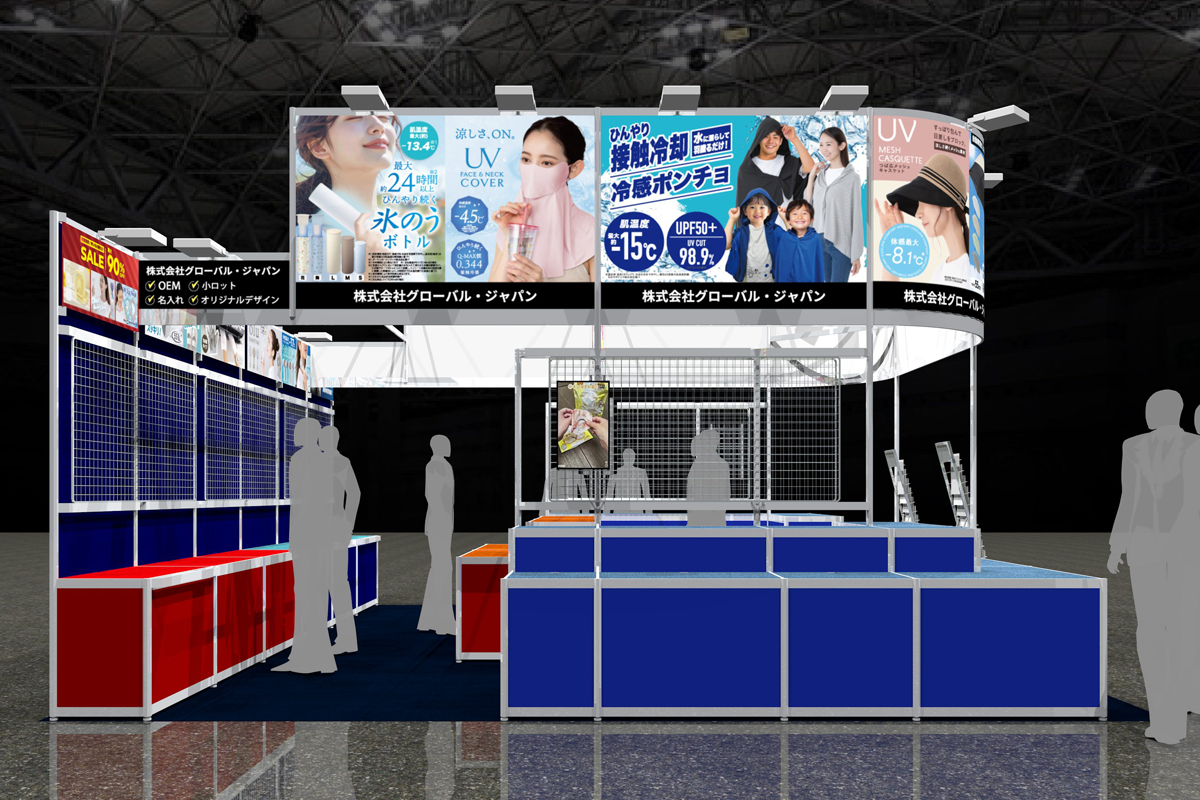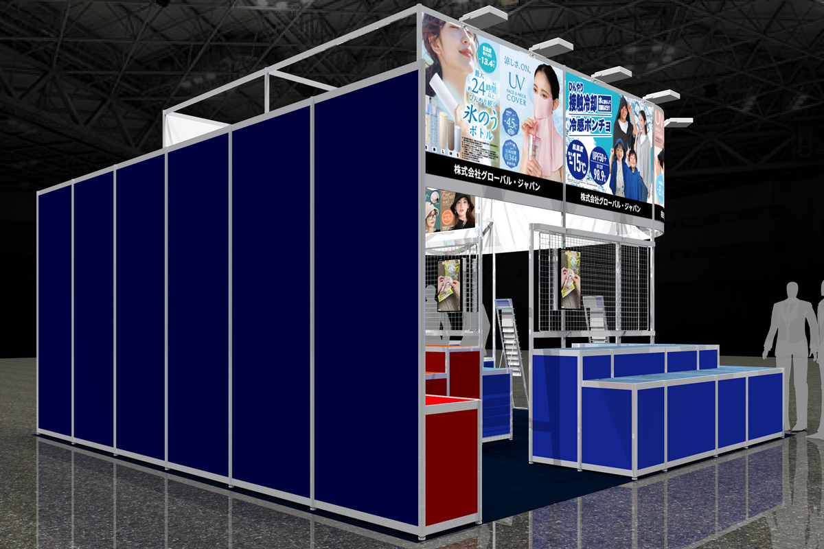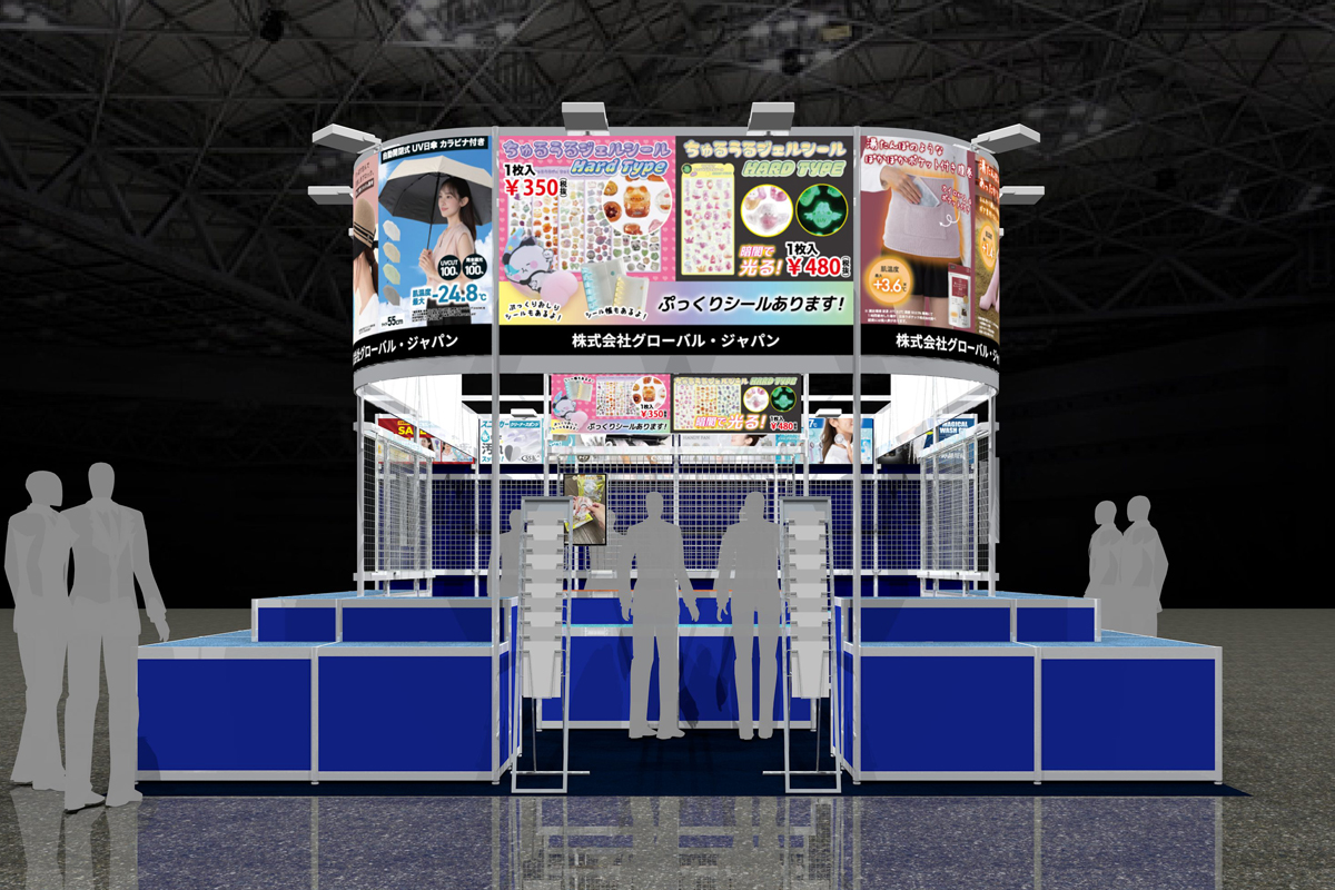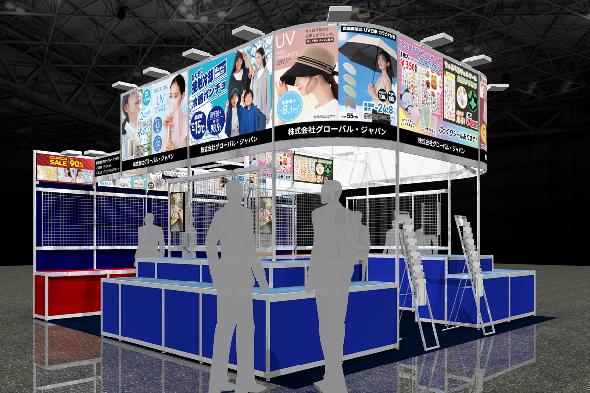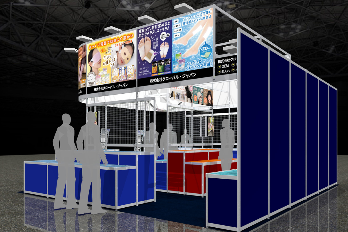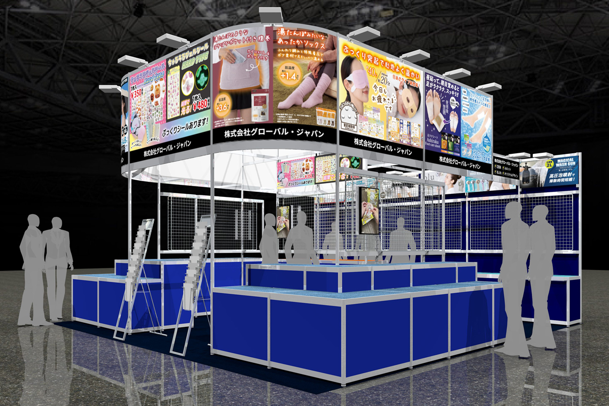 ご出展企業の商材は様々な雑貨のため、商材を訴求する看板では各商材をビジュアルと共に表示し来場者にアピールします。ブースの造作はできるだけ商品を陳列できるように、メッシュパネルを多く設置しています。また展示台は2段にして、商材を立体的に陳列できるよう演出しています。展示台の上にはパンチカーペットを敷設し、商材のカテゴリー分けなどを行っています。