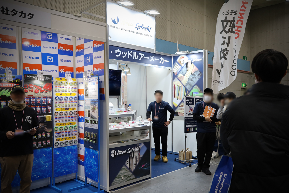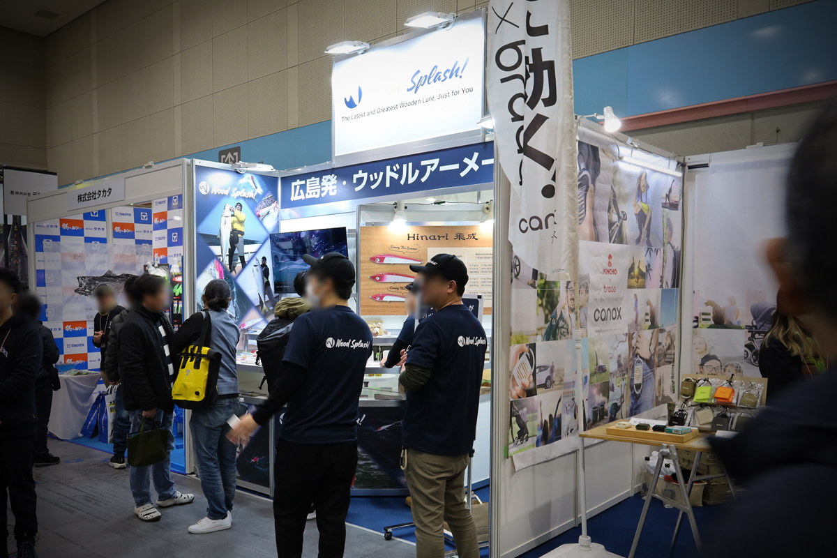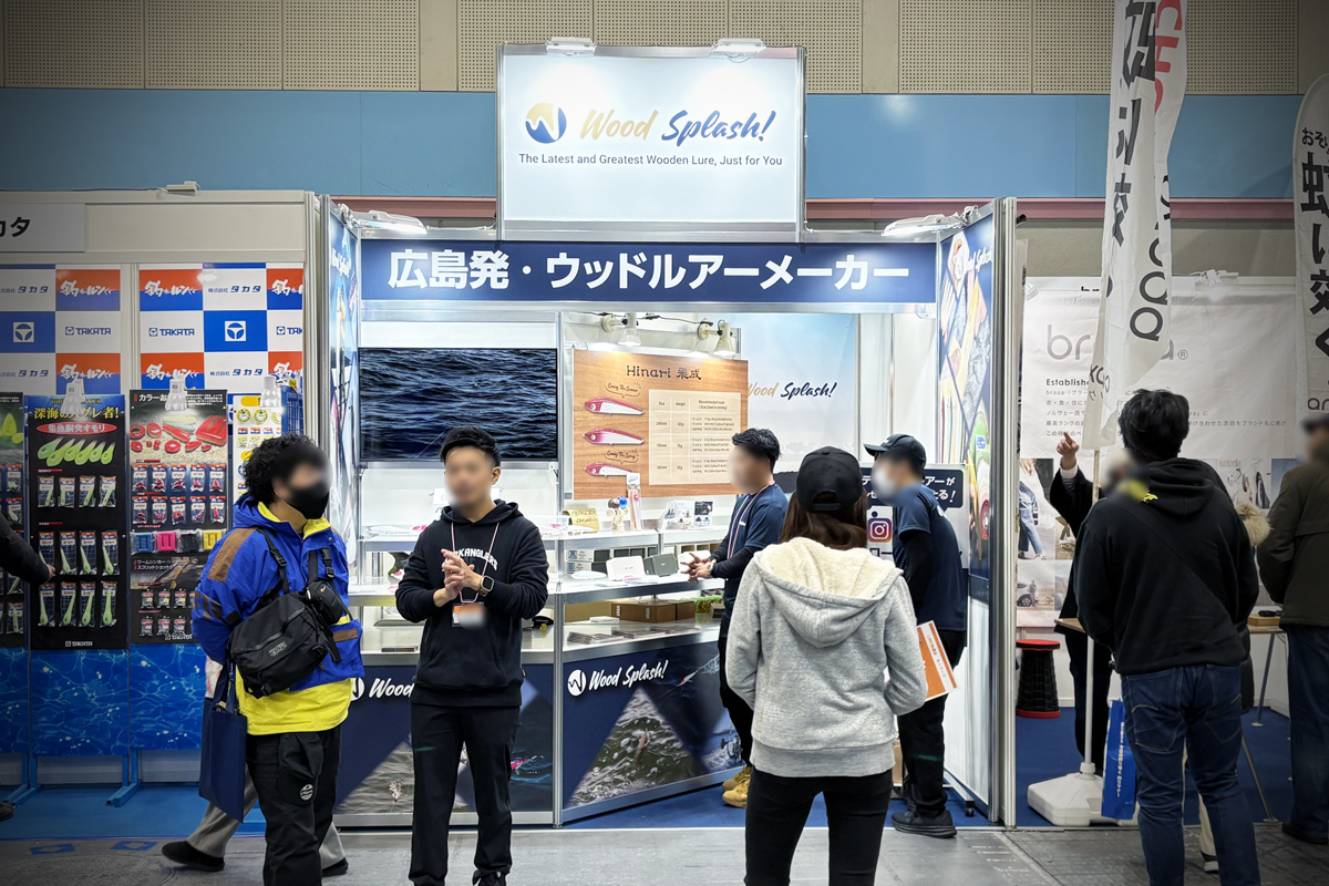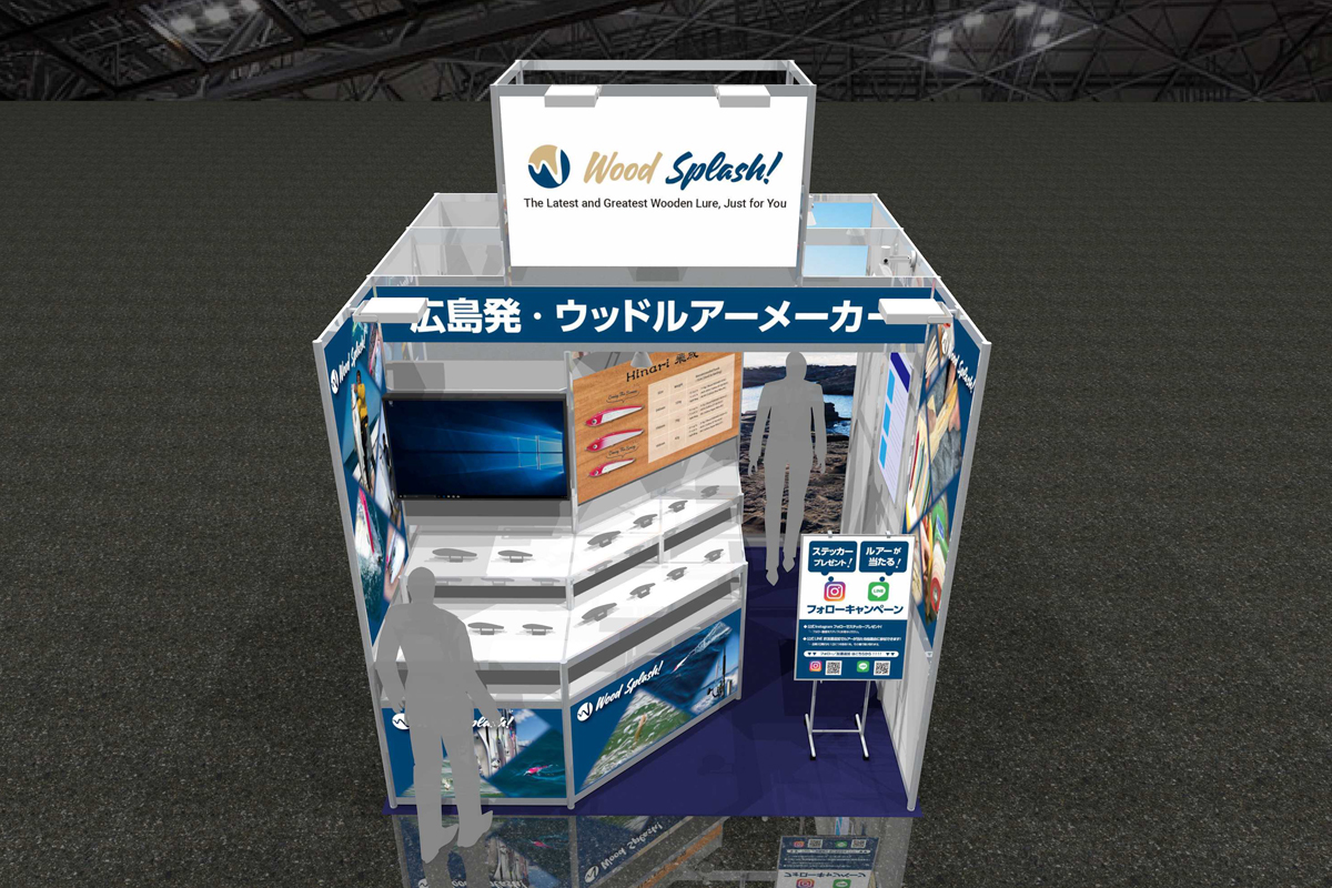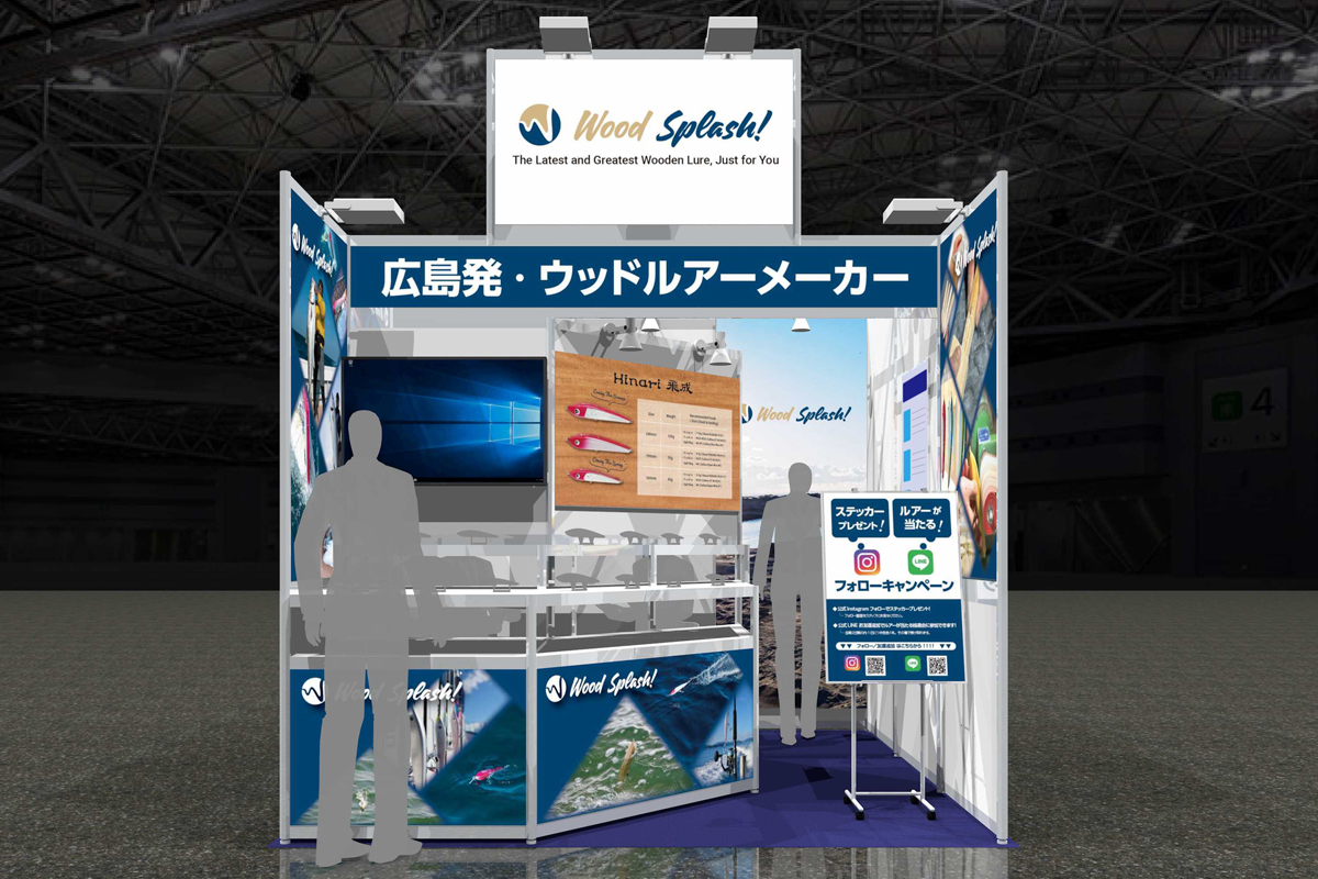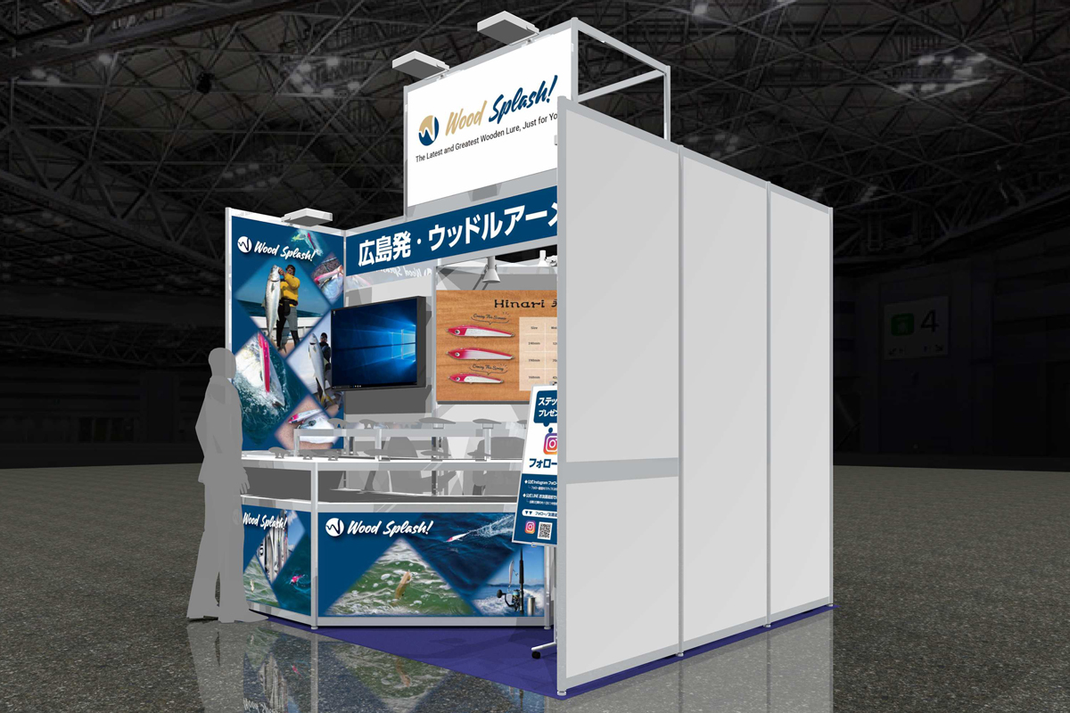 2026年2月に開催された「フィッシングショーOSAKA」にご出展されたお客様のブース事例です。ブースの大きさは幅3m×奥行3mで、両隣に他社ブースがあり1つの通路に面した「1面解放」の小間位置となります。フィッシングショーは、日本釣用品工業会や各地の釣具協同組合が主催する、最新の釣具展示・体験・販売イベントで、各メーカーの新製品披露、有名プロのトークショー、体験イベント等が行われる釣り人必見の展示会です。