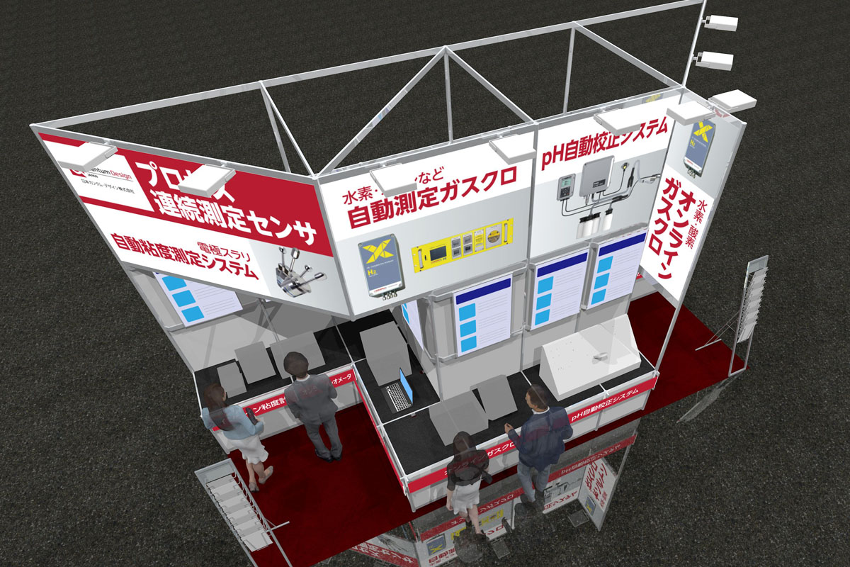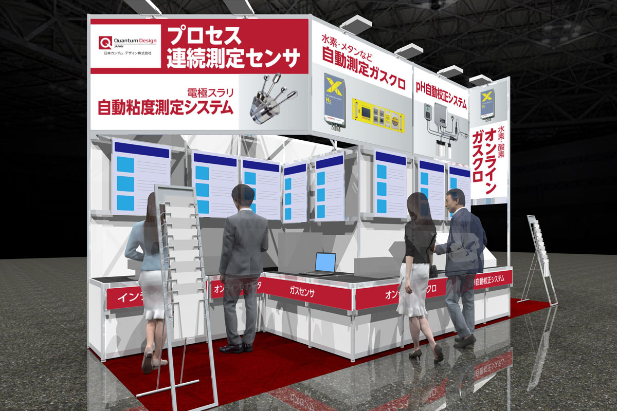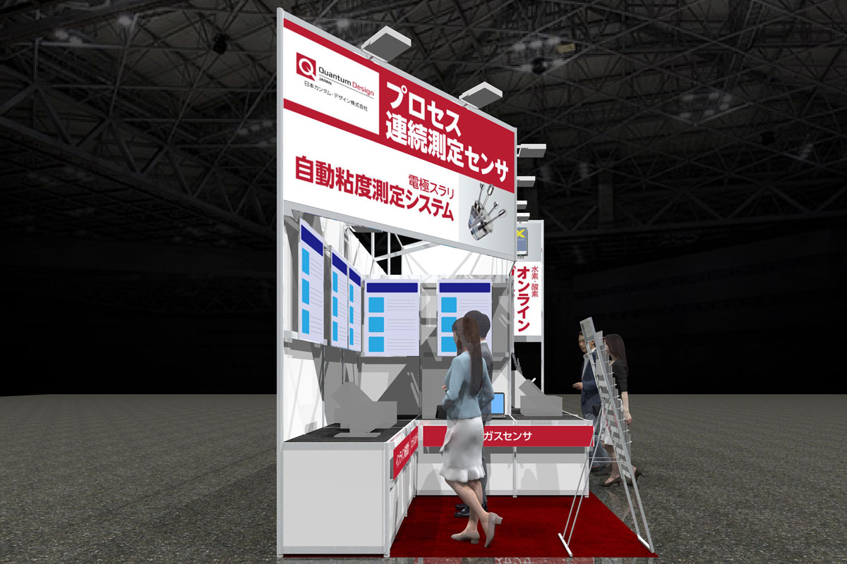 ご出展企業の商材は水素・燃料電池の開発には欠かせない各種検査機器です。通路に面する縦型看板・上部の看板で取り扱っている各種検査機器を表示し、来場者に商材をアピールします。壁面のLEDパネルによる各商材の説明の下に関連機器などを設置し、接客しやすい構成としています。また通路際向かって右手の白い傾斜展示台は木工で仕上げています。弊社では木工ブースも取り扱っているため、このような部分的な木工造作も可能です。