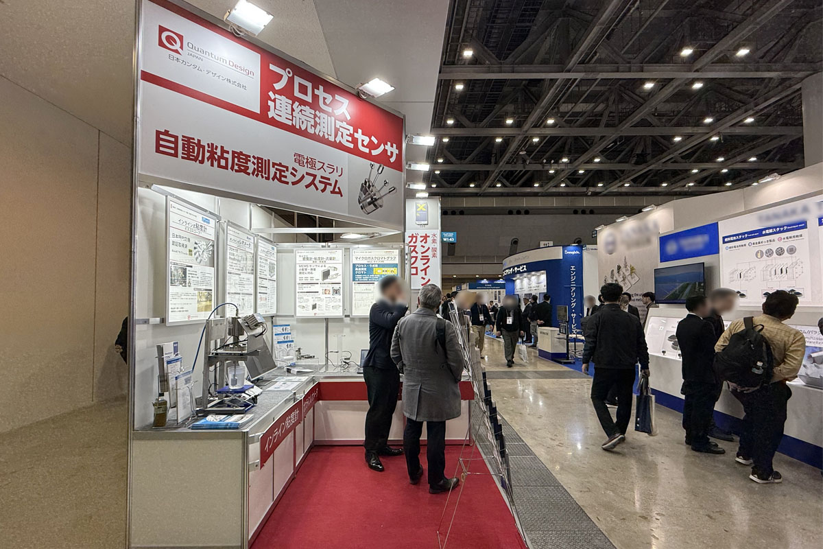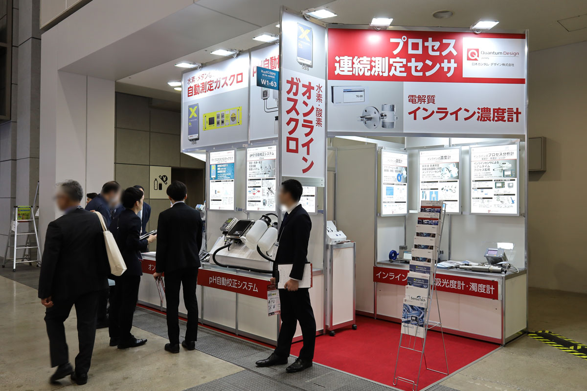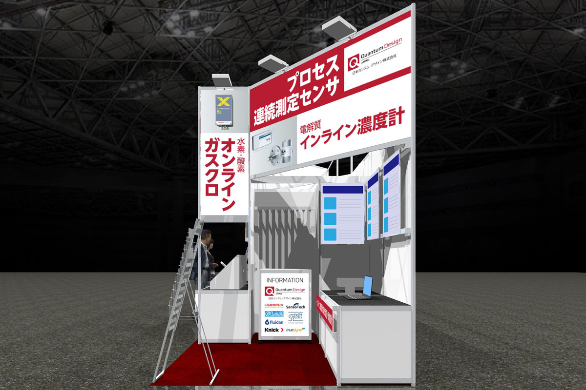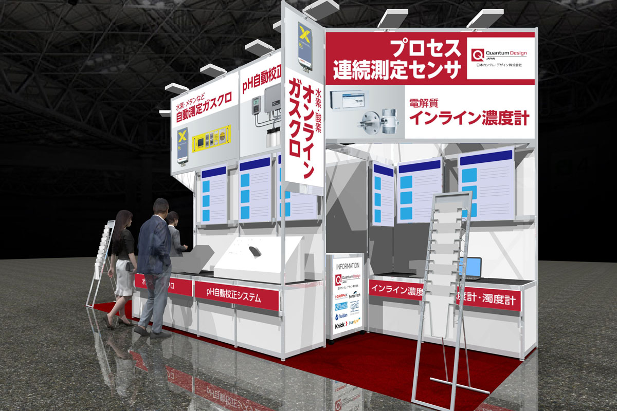 ご出展企業の商材は水素・燃料電池の開発には欠かせない各種検査機器です。通路に面する縦型看板・上部の看板で取り扱っている各種検査機器を表示し、来場者に商材をアピールします。壁面のLEDパネルによる各商材の説明の下に関連機器などを設置し、接客しやすい構成としています。また通路際向かって右手の白い傾斜展示台は木工で仕上げています。弊社では木工ブースも取り扱っているため、このような部分的な木工造作も可能です。